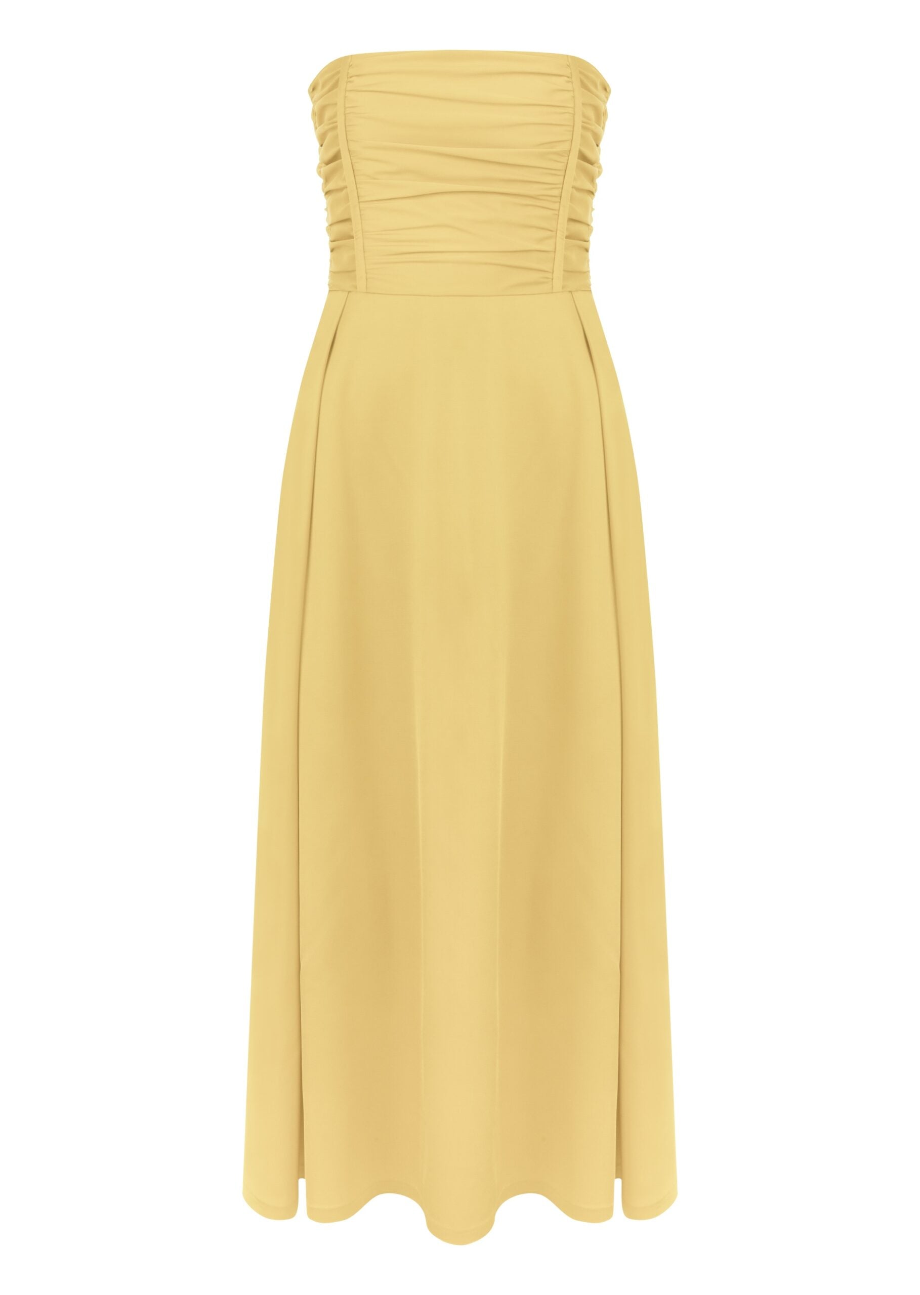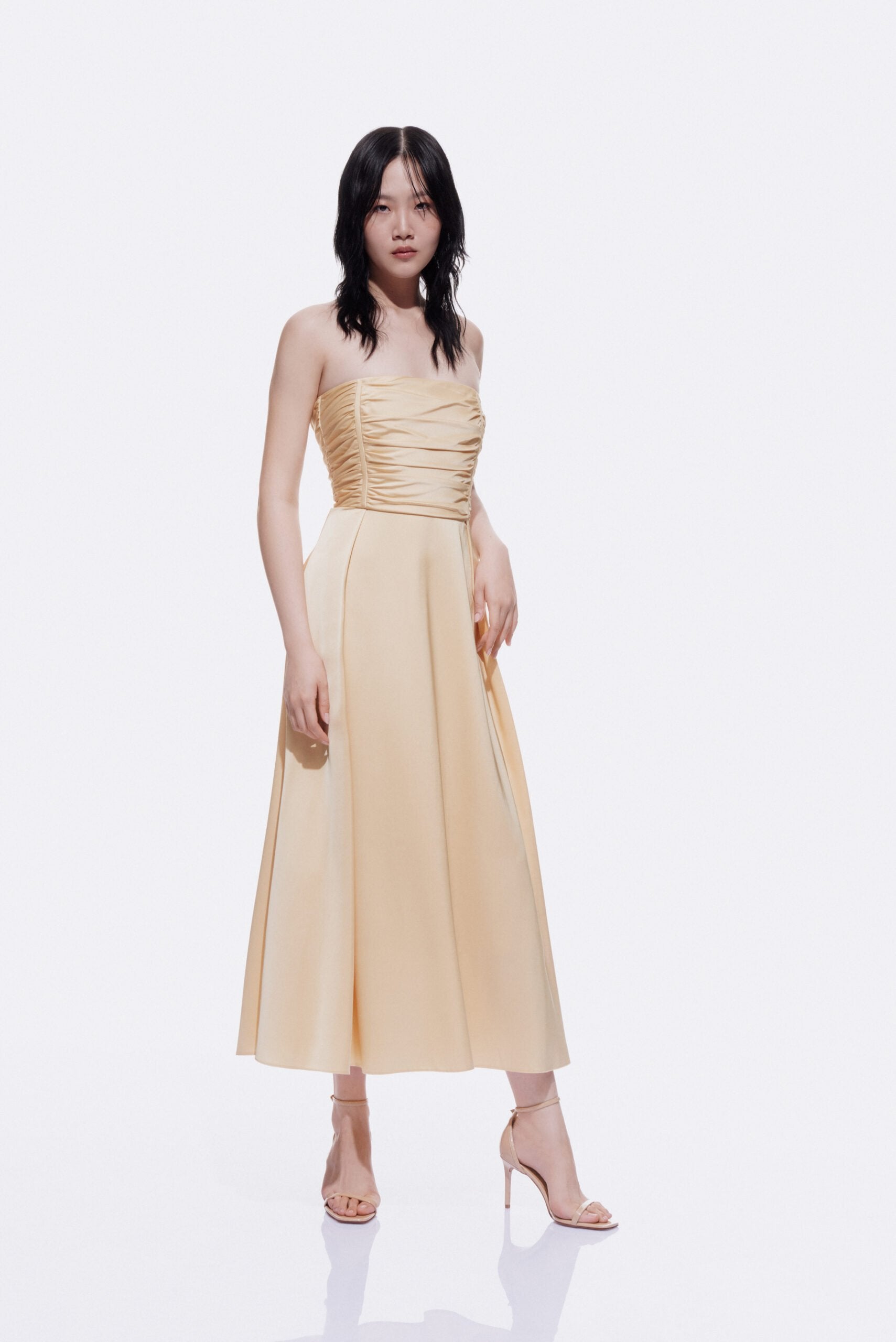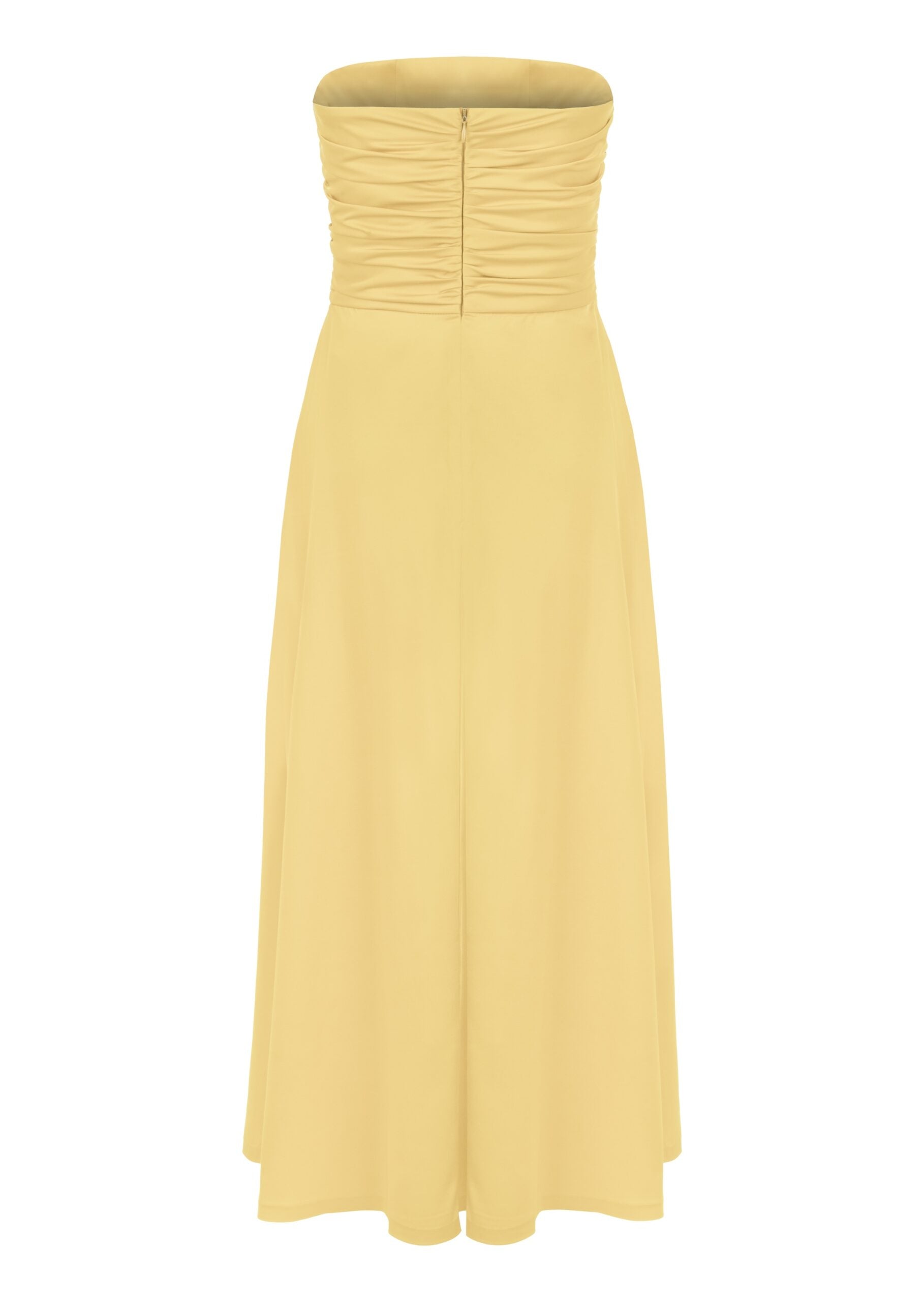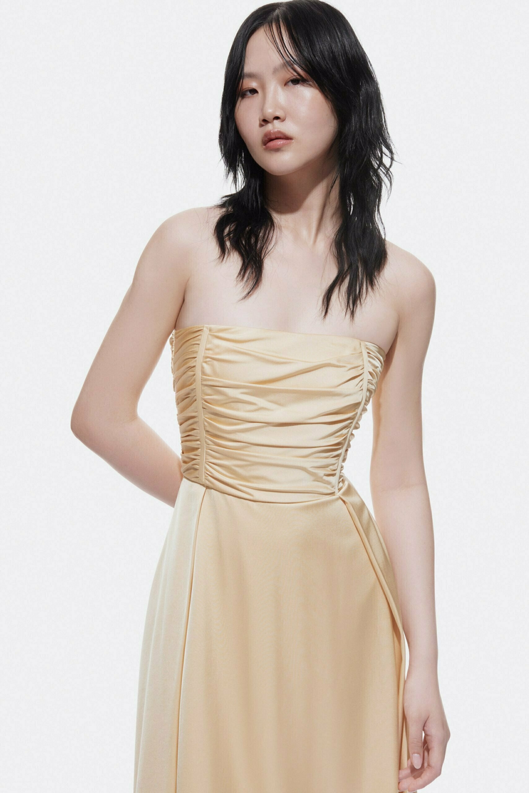 Designed for a slim fit at the bust and loose at the hip, strapless