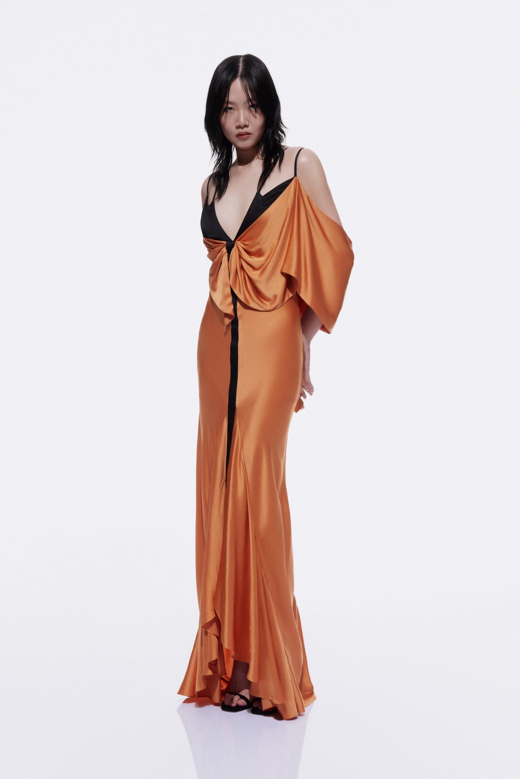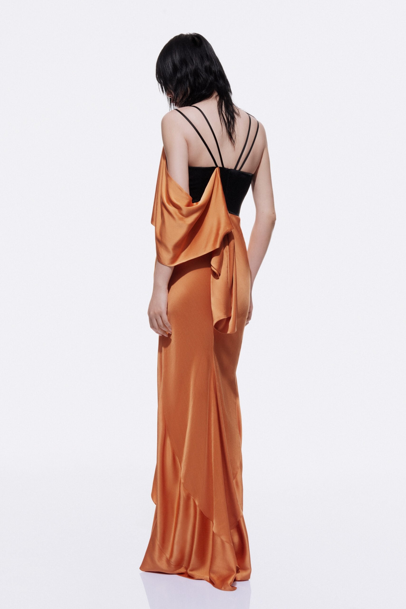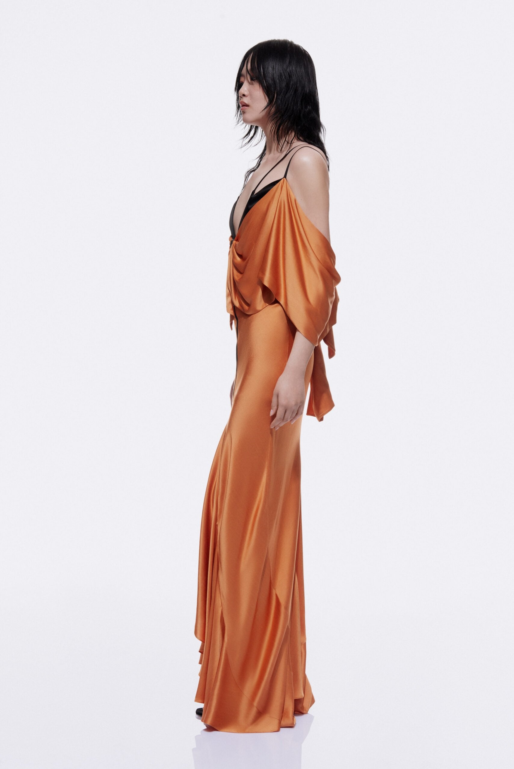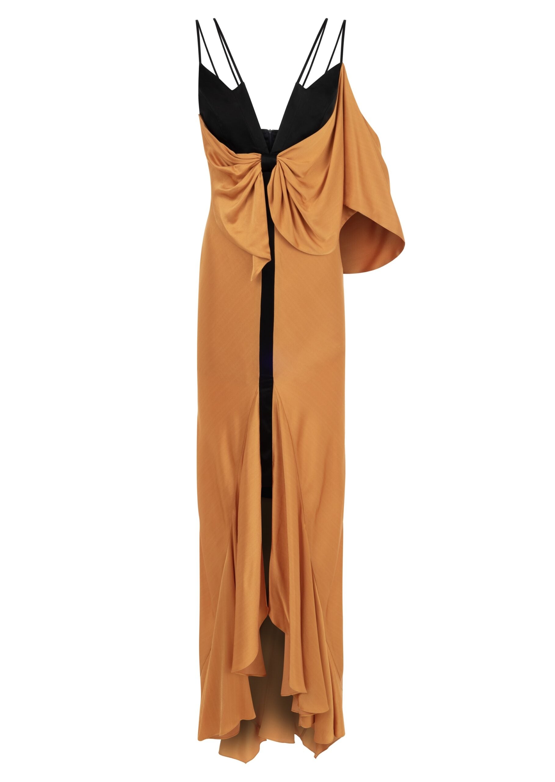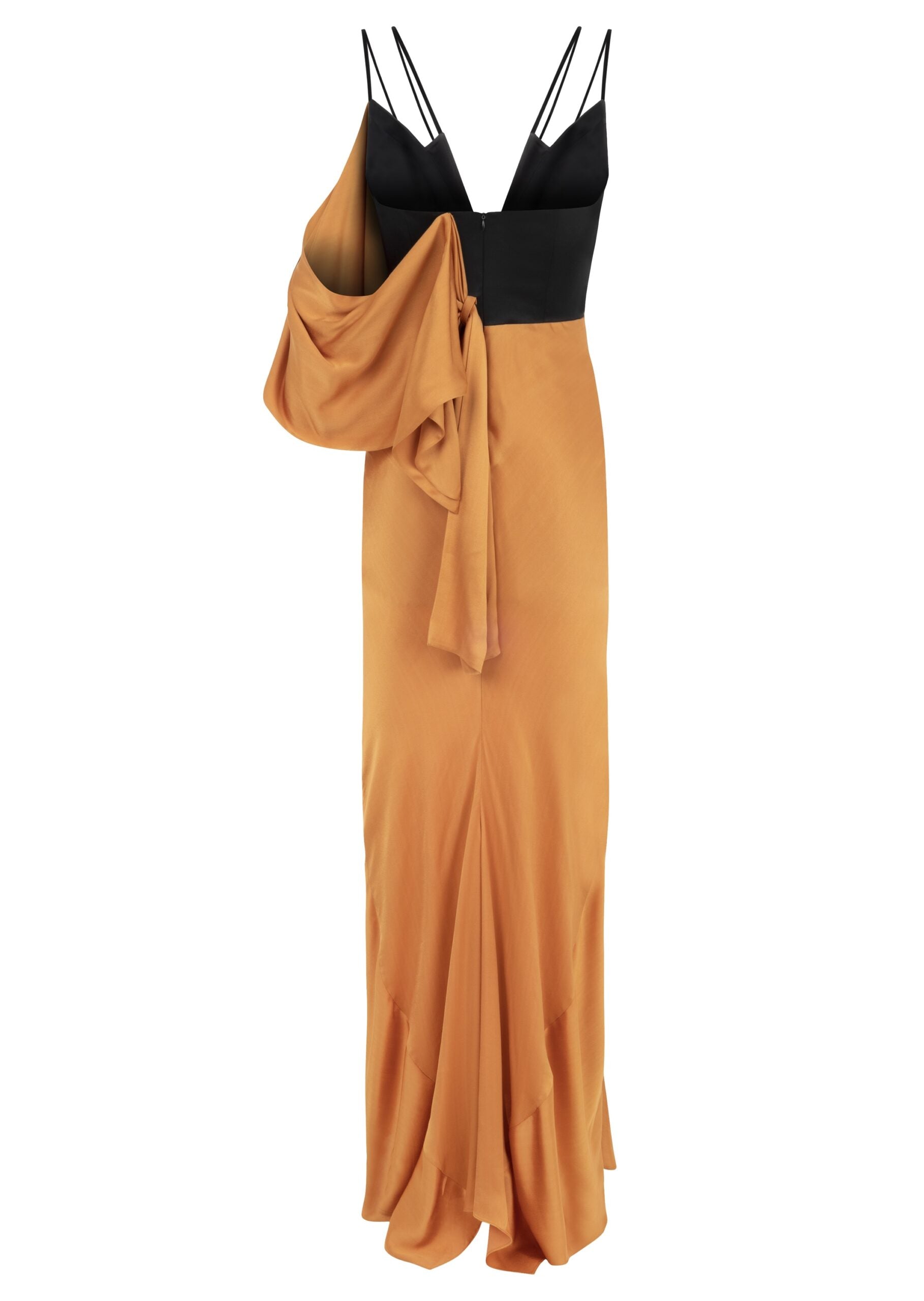The dress that has it all, feminitity and comfort. “Ava” is one of the simplest and most unique designs that can transition your look from day to night with its striking sun kissed orange and black colour.