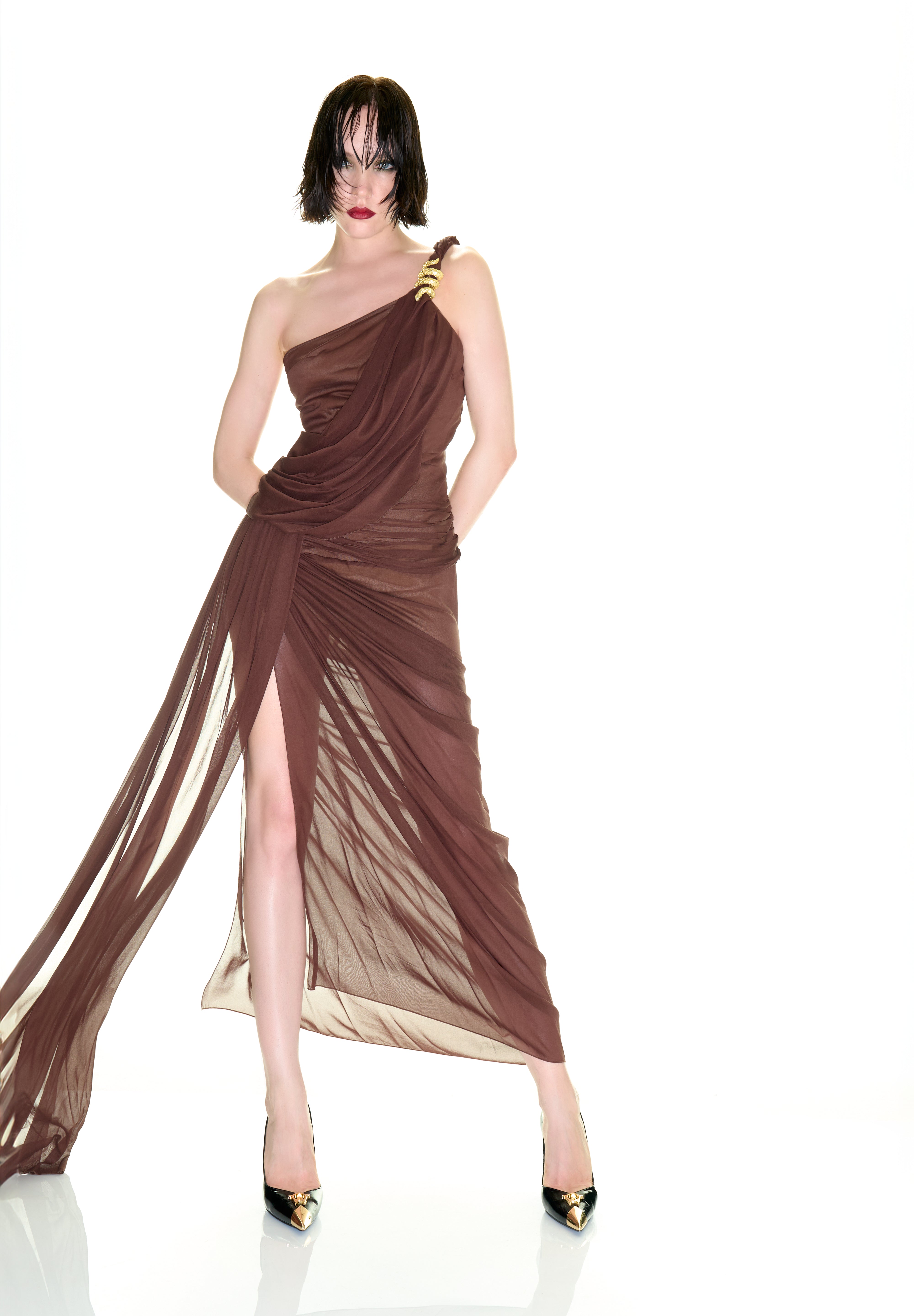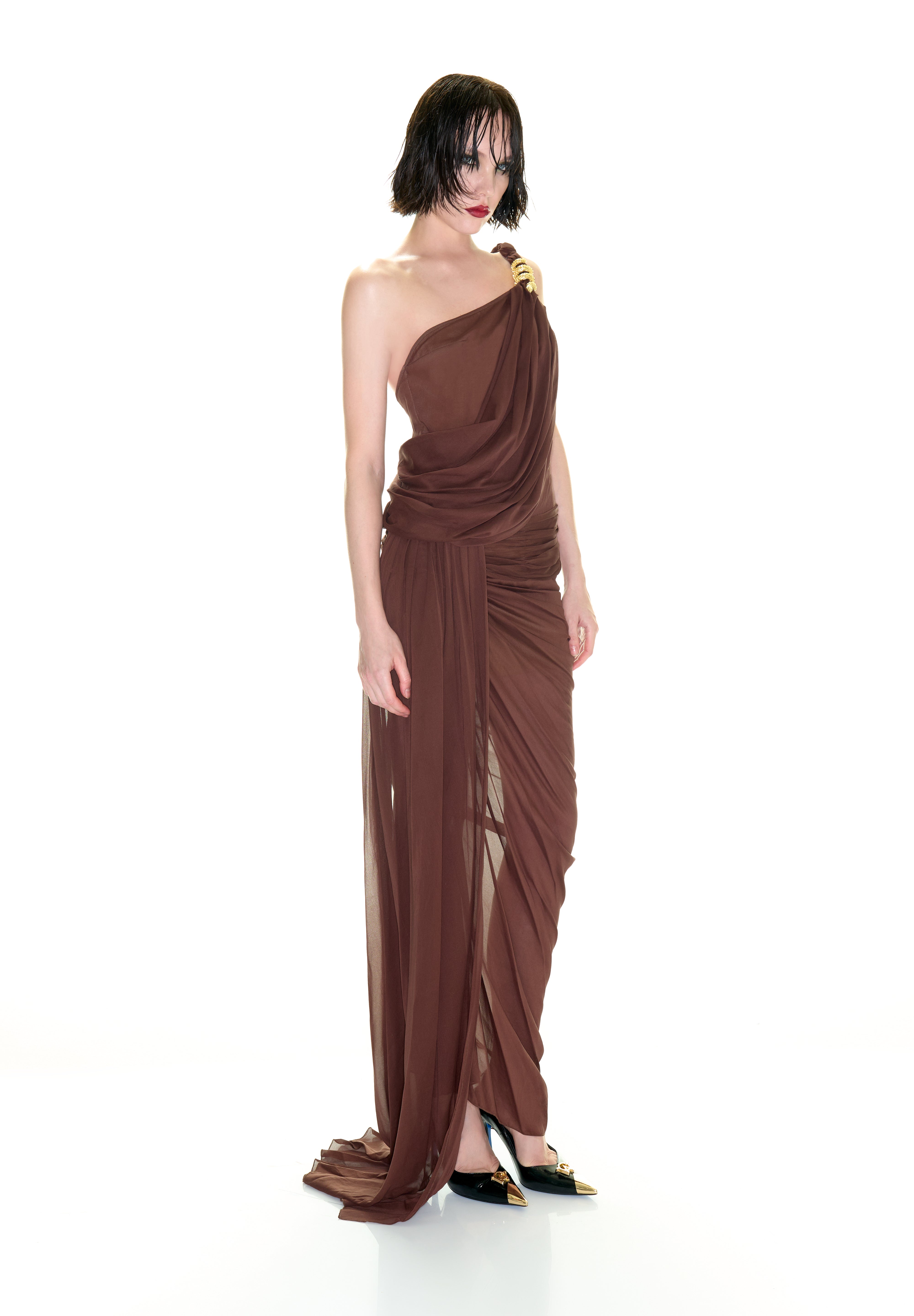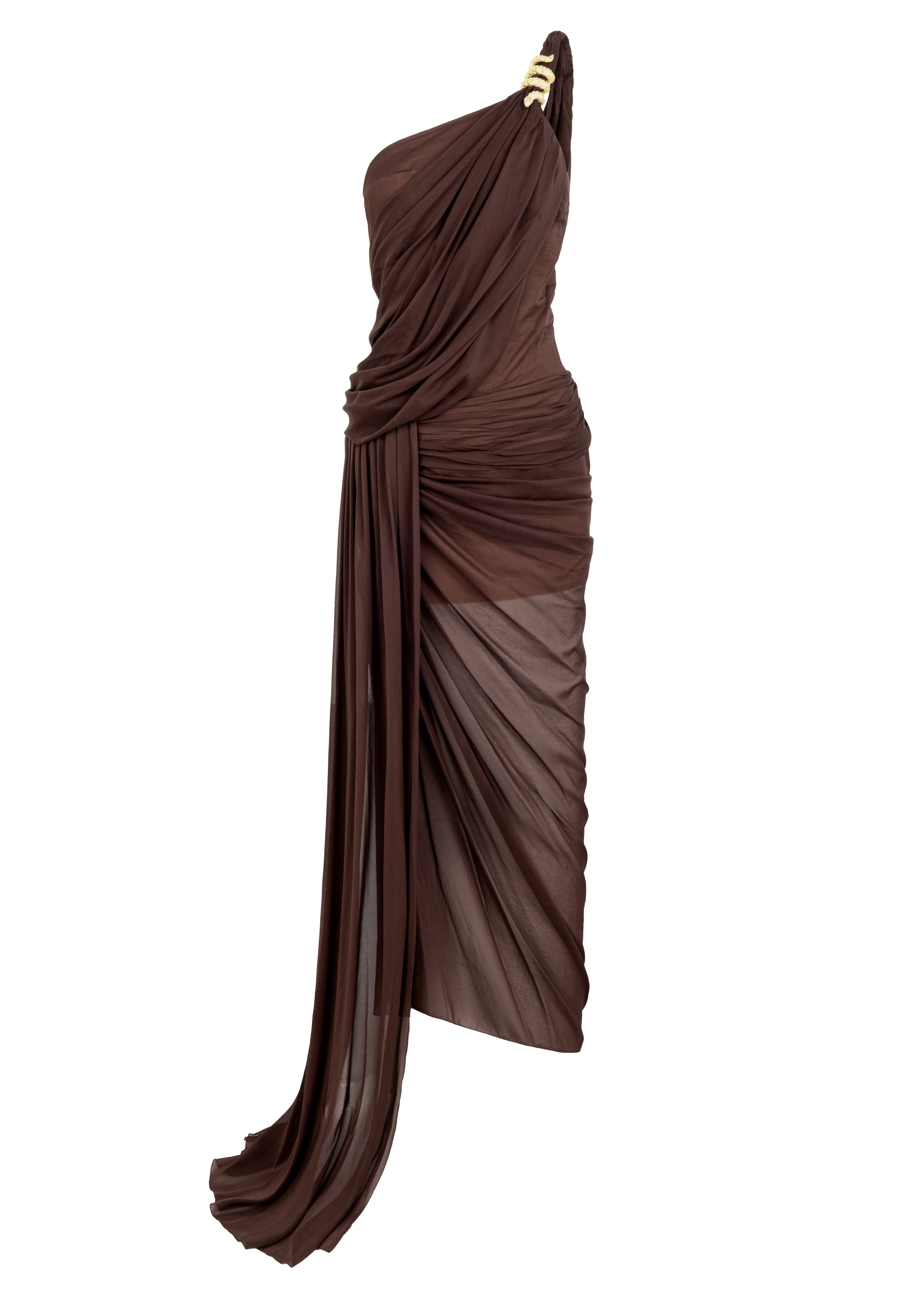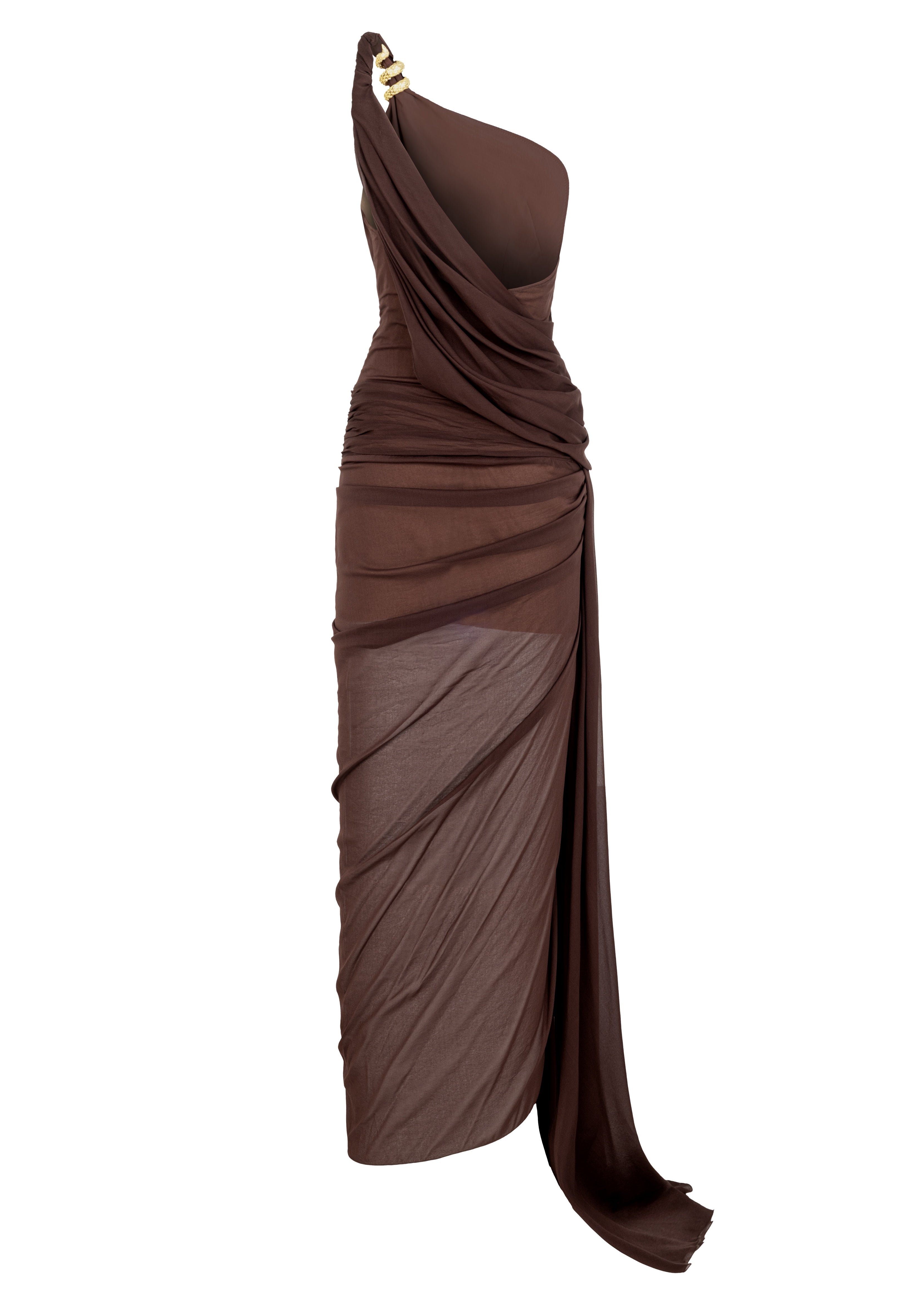 The “Belle” dress presents a feminine stance with its elegant draping and one-shoulder design. With its flowing fabric and deep slit, this dress captures a romantic yet sophisticated feel, making it a noble and perfect choice for special occasions.