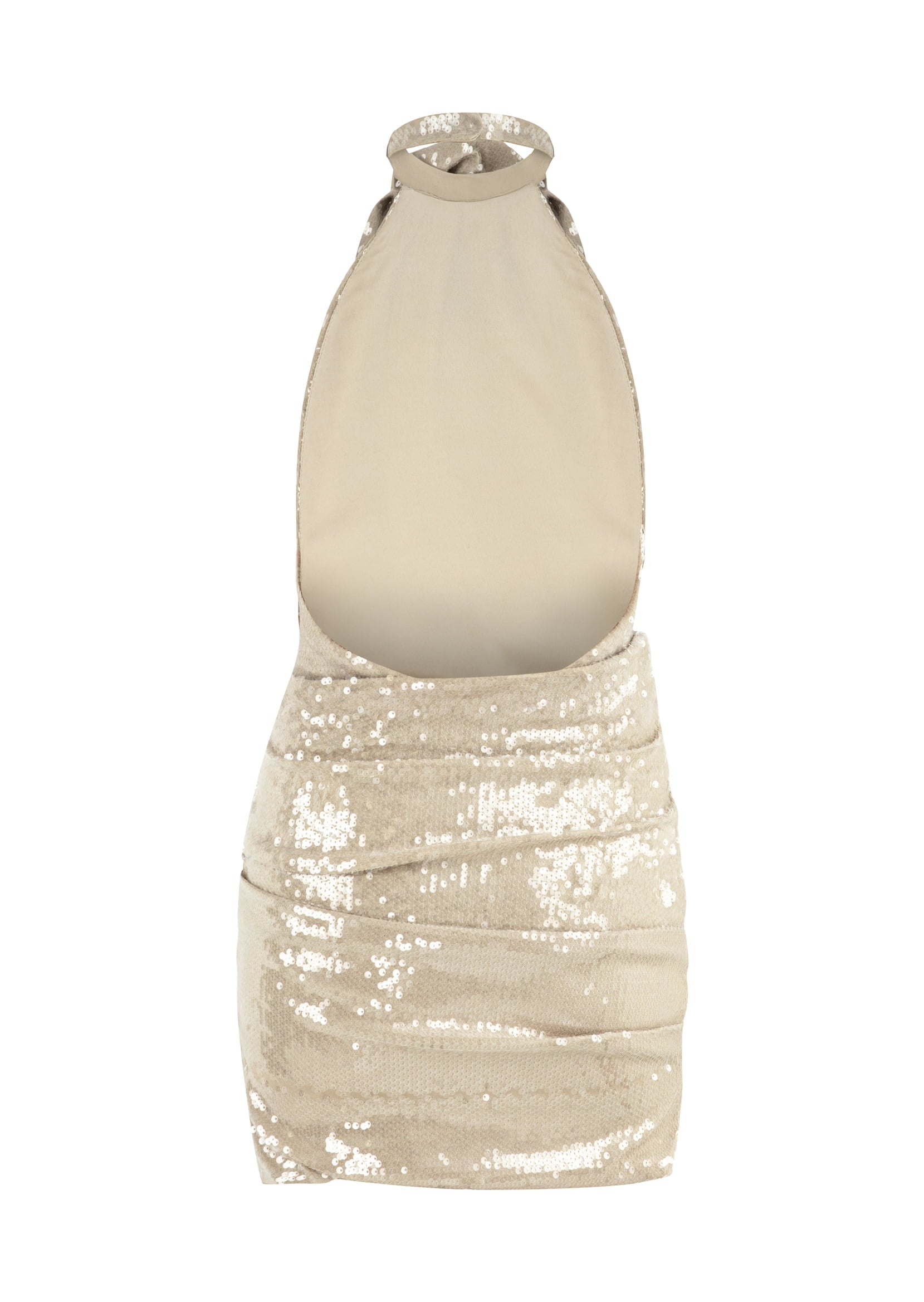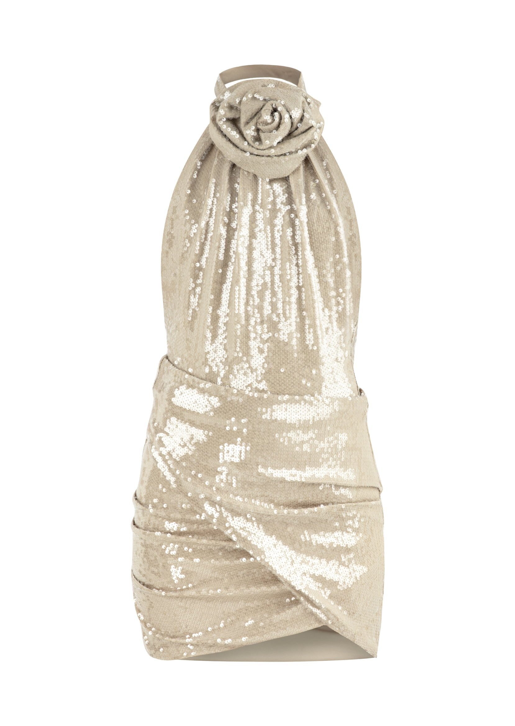 Time to shine with the “Bianca”! Stunning beige sequins, delicate rose details around the neckline and slinky mini skirt… Ready to take your high-shine look to the dance floor!