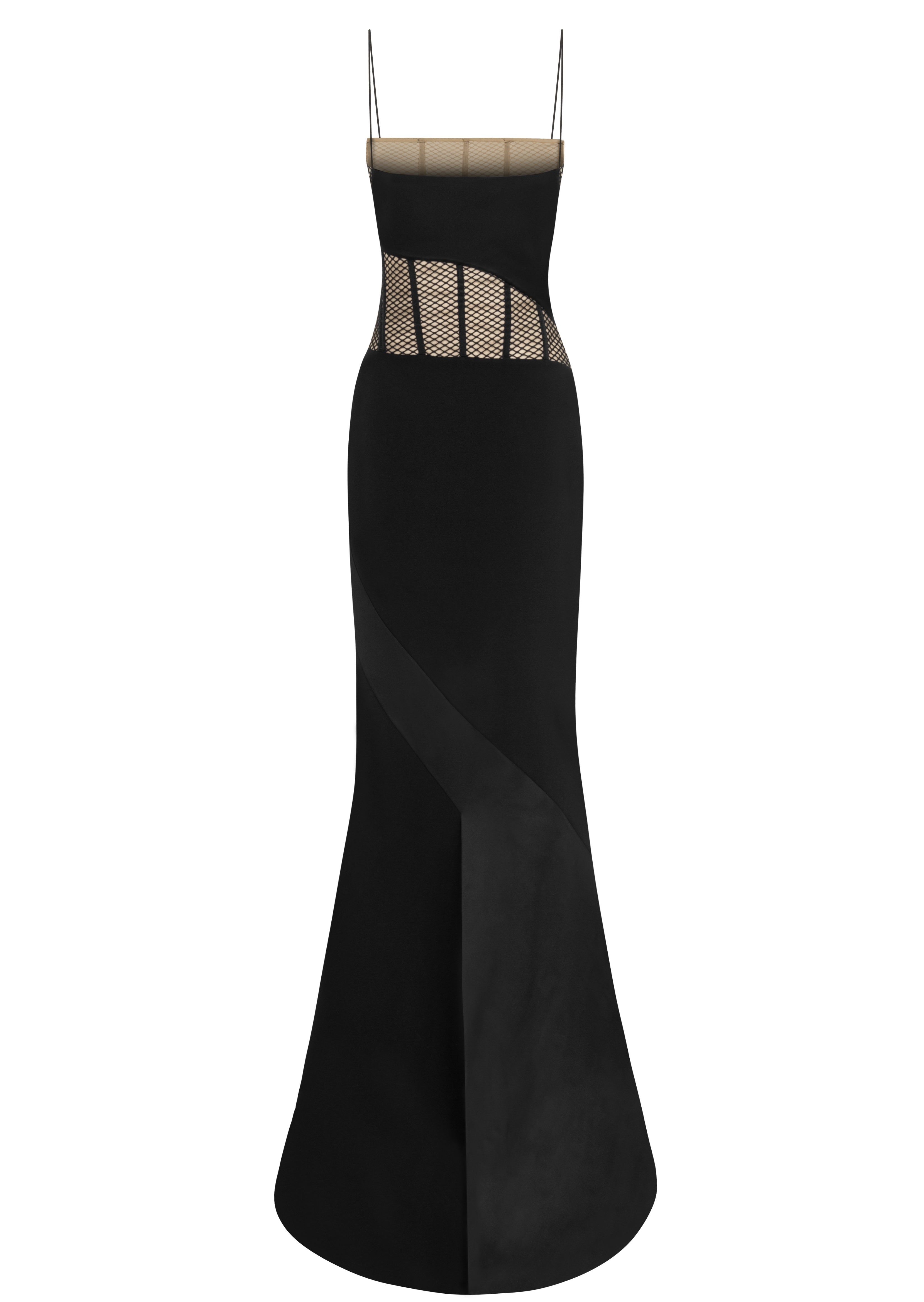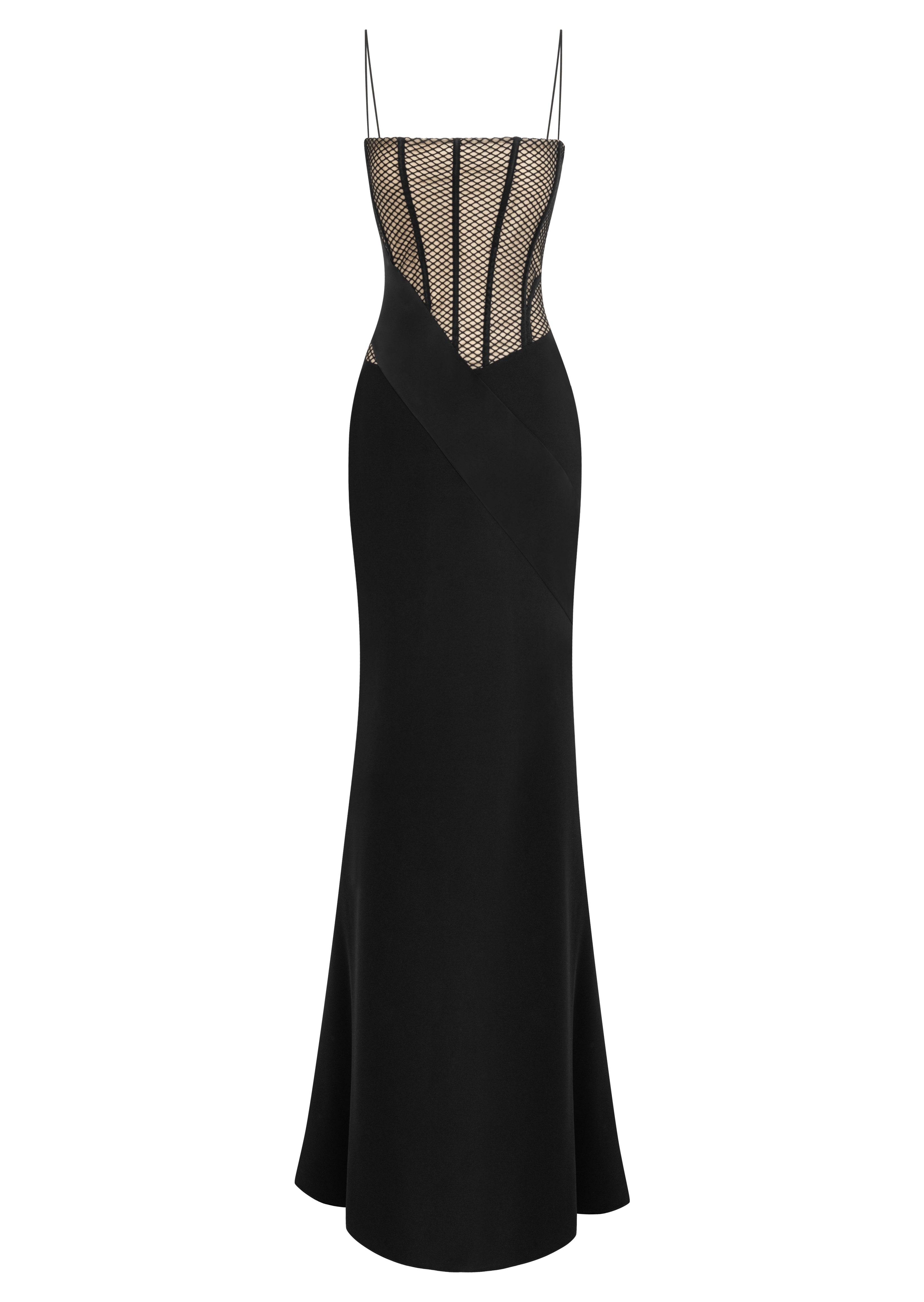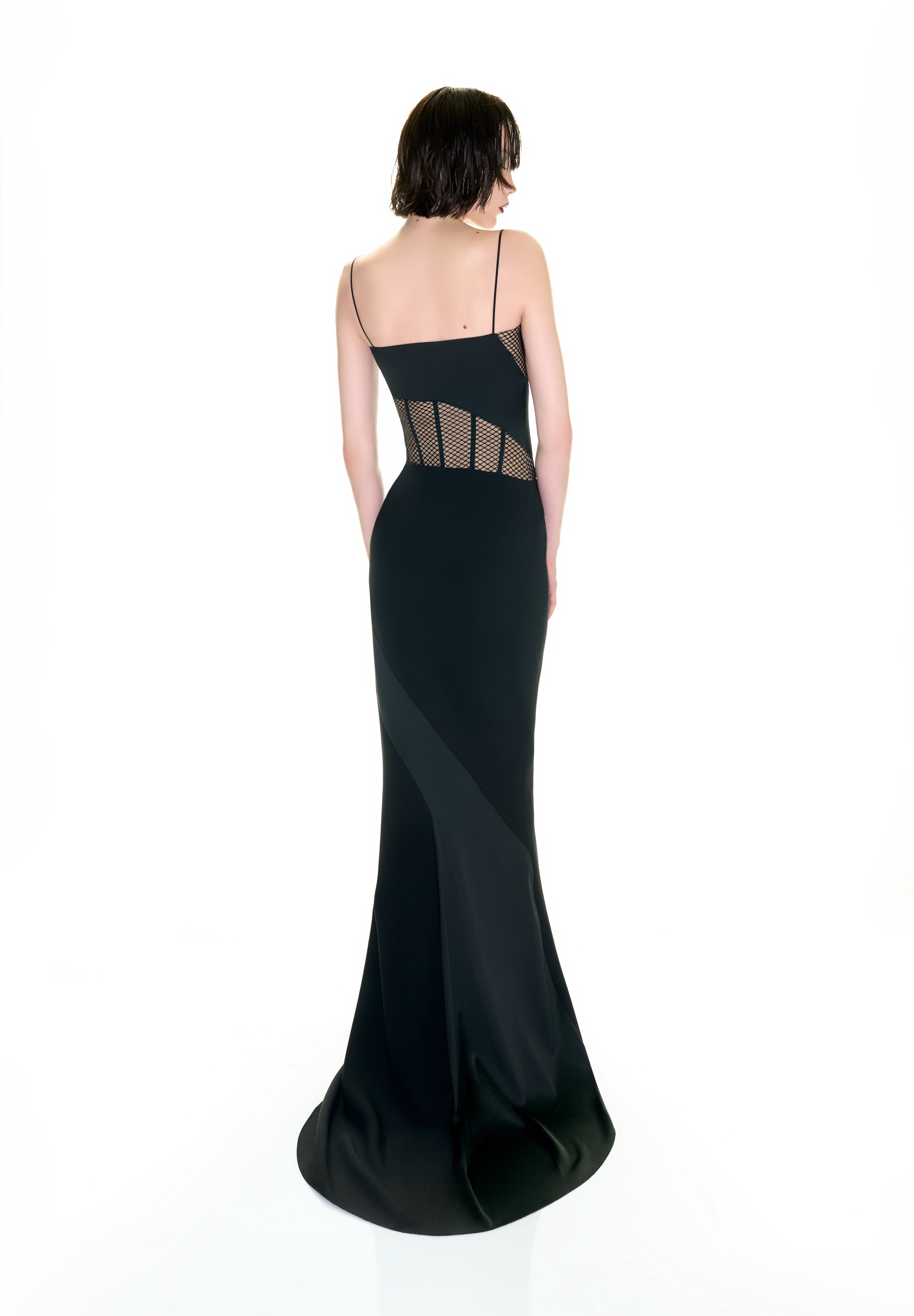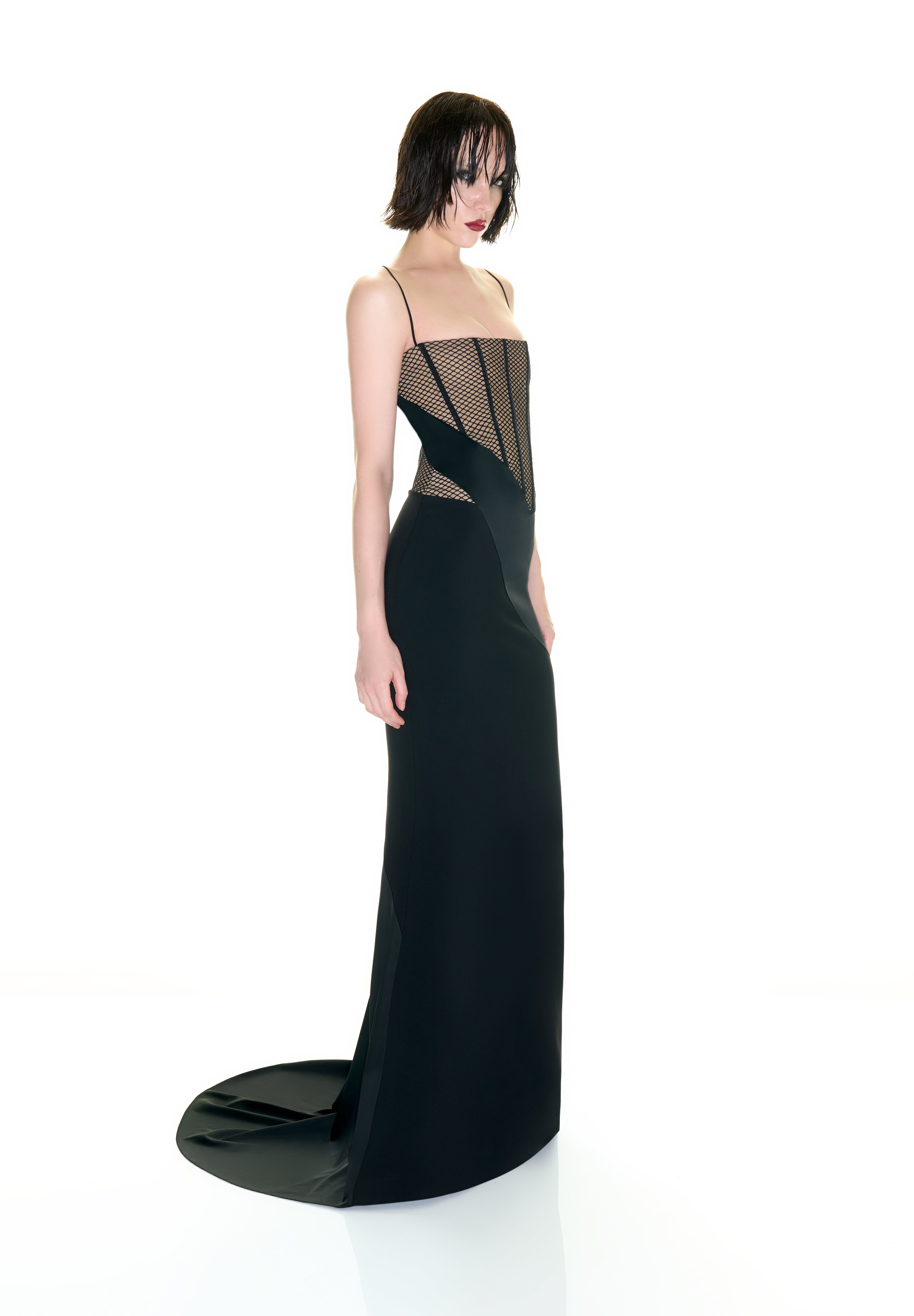 Featuring a sheer corset detail and thin straps, the “Catelyn” dress is characterized by its form-fitting cut, long train, and modern lines, creating an attention-grabbing style for special occasions.
