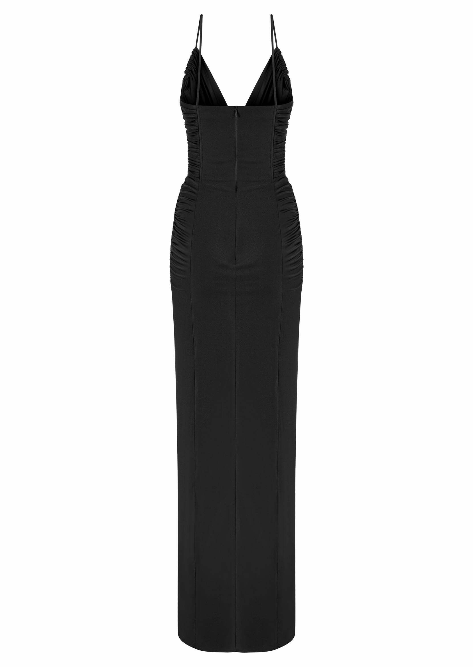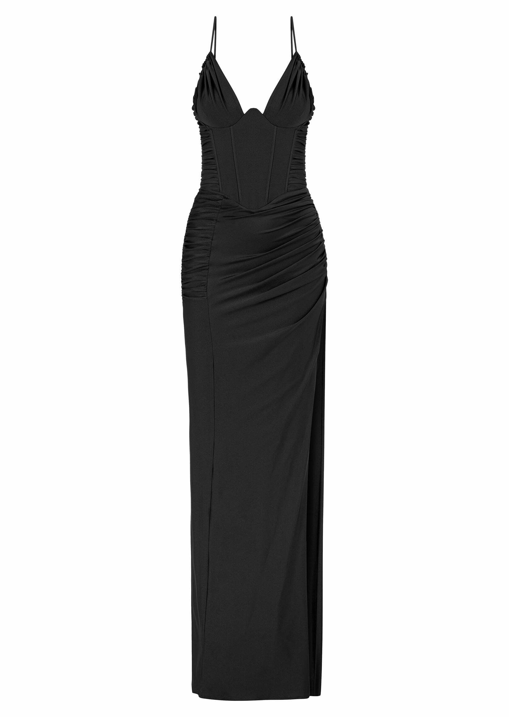The “Elettra” dress, inspired by the Italian actress, writer and model, Isabella Elettra Rossellini, dazzles in elegant black, and creates a fierce look with its corset details and deep slit. A must for sophisticated nightlife.