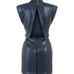 The Élodie dress combines a sleek mini cut with a subtle metallic finish that catches the light. Its structured shape creates a confident line, while the deep tone adds a touch of mystery. A modern design made for evenings where simplicity feels powerful.