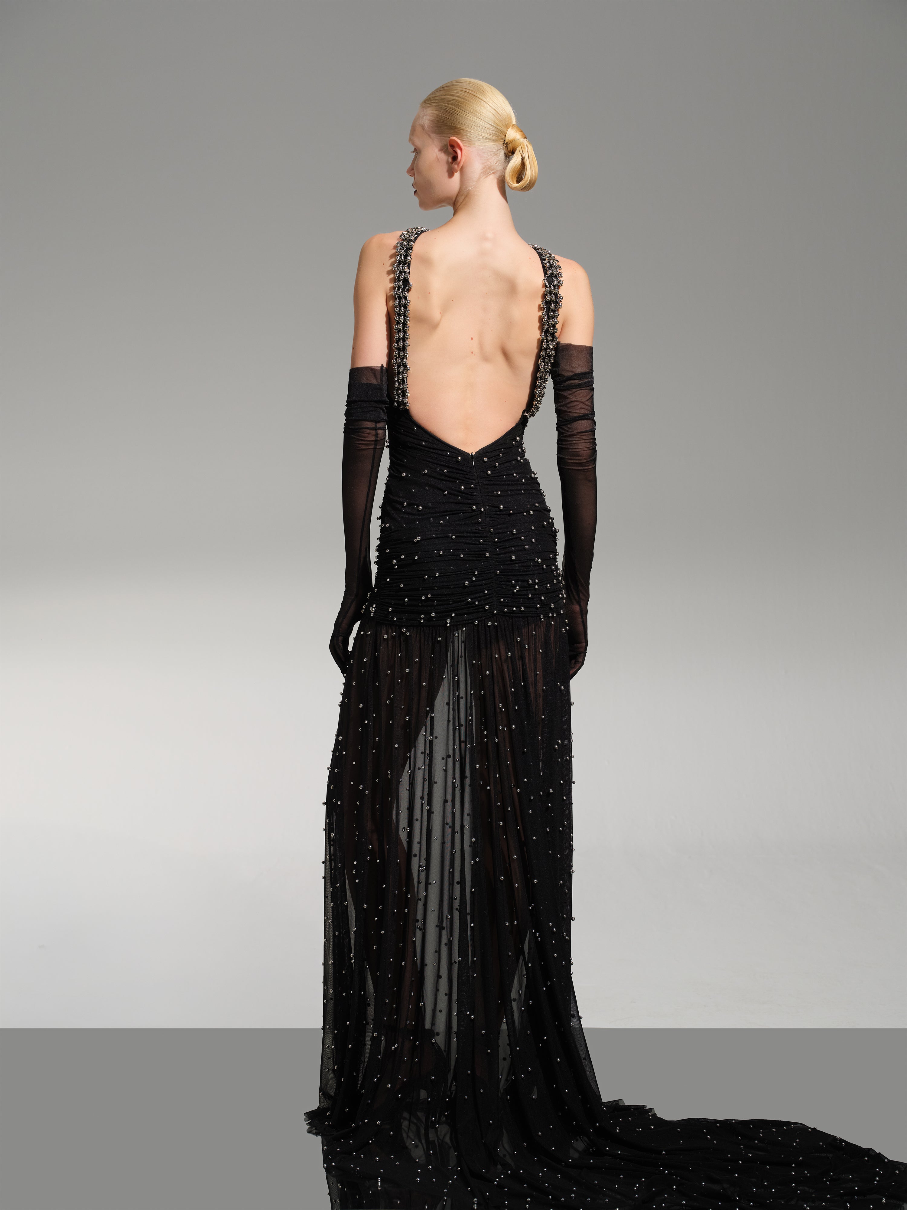 Sheer layers and delicate embellishment bring depth to this floor-length style, creating a balance of allure and elegance. The fitted bodice contrasts with fluid fabric that flows as you move. The Elsa dress is crafted for after-dark occasions where sophistication takes centre stage.
