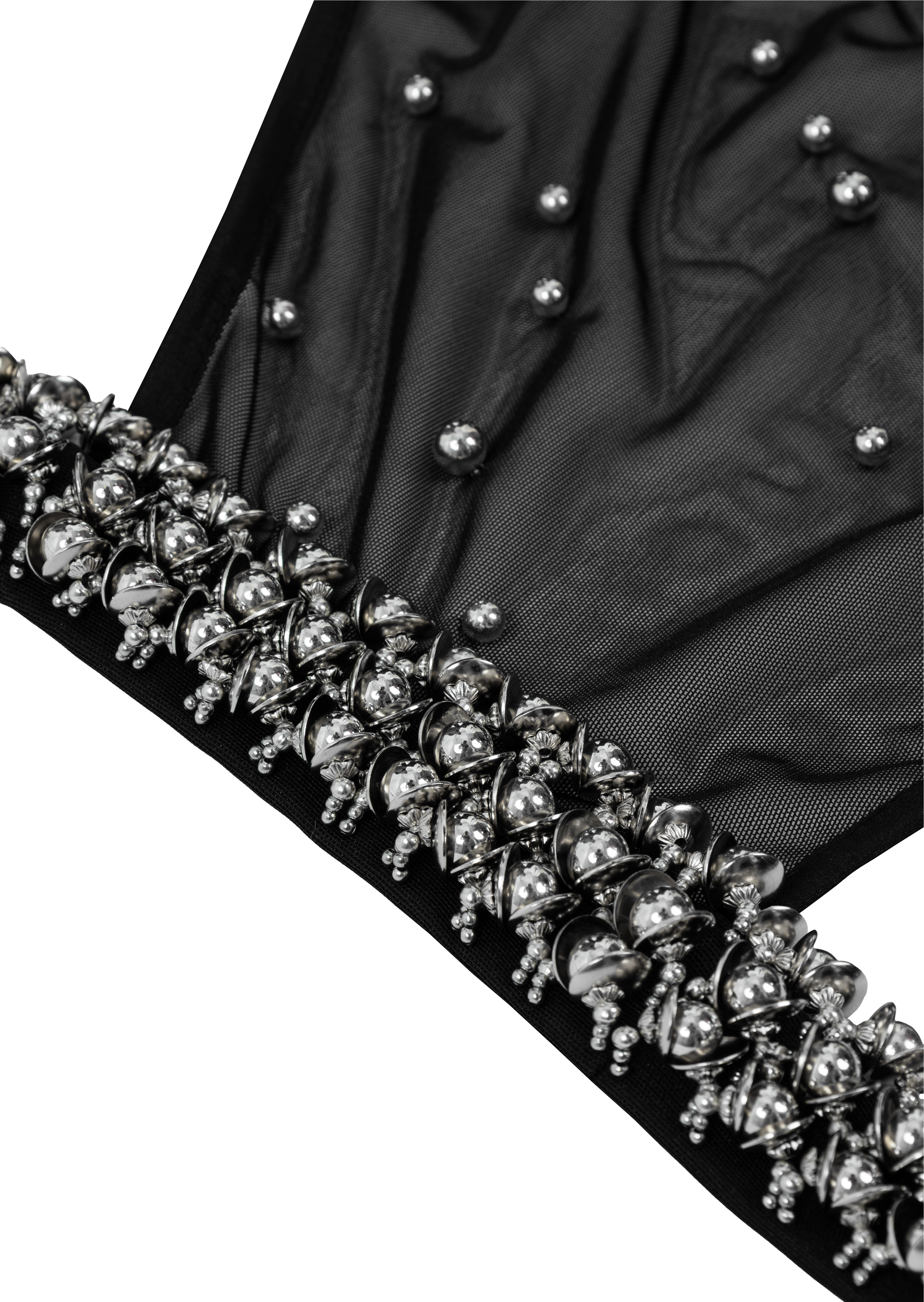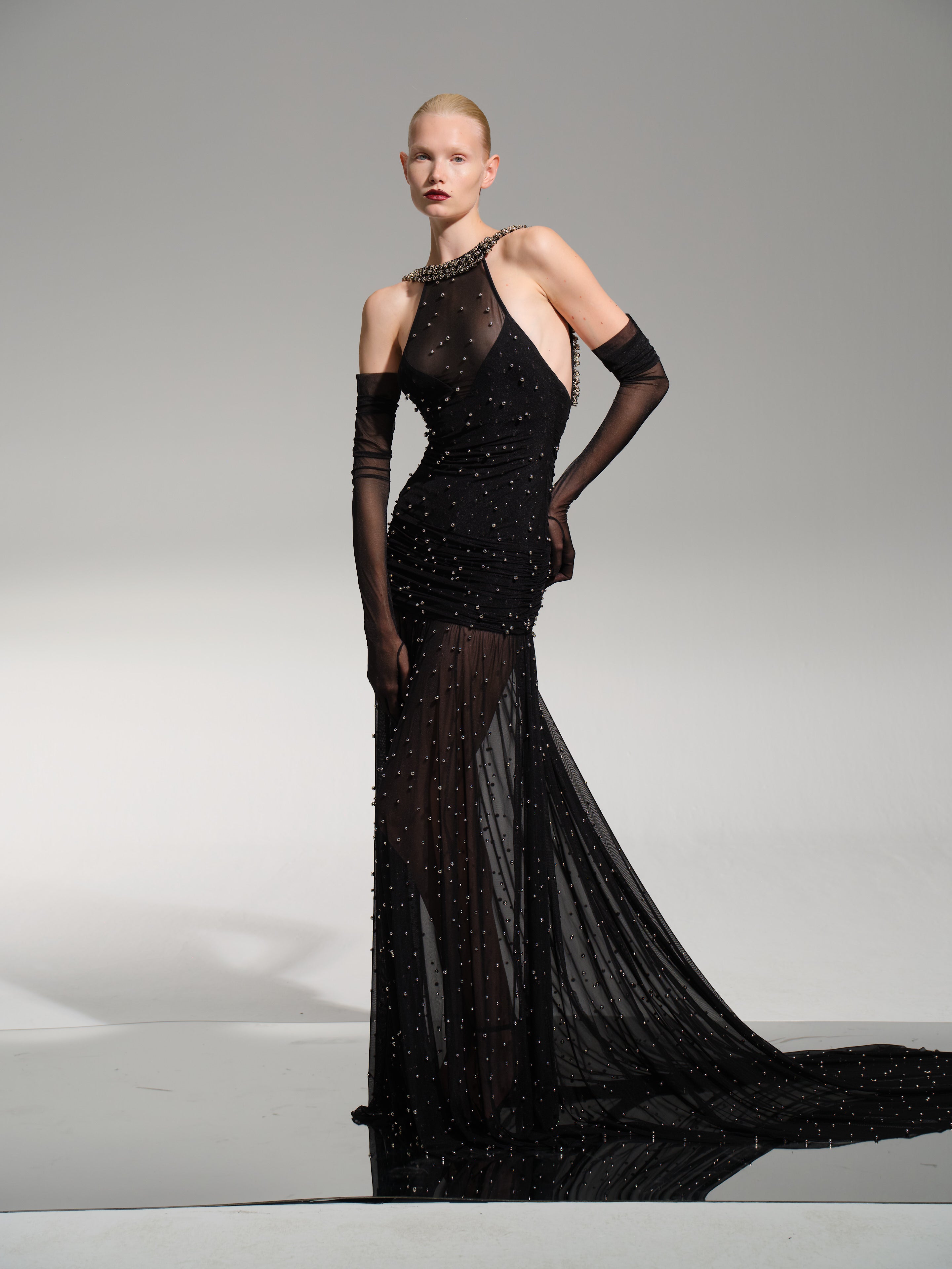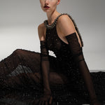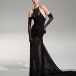 Halter Neck Sheer Embroidered Maxi Dress with Matching Gloves