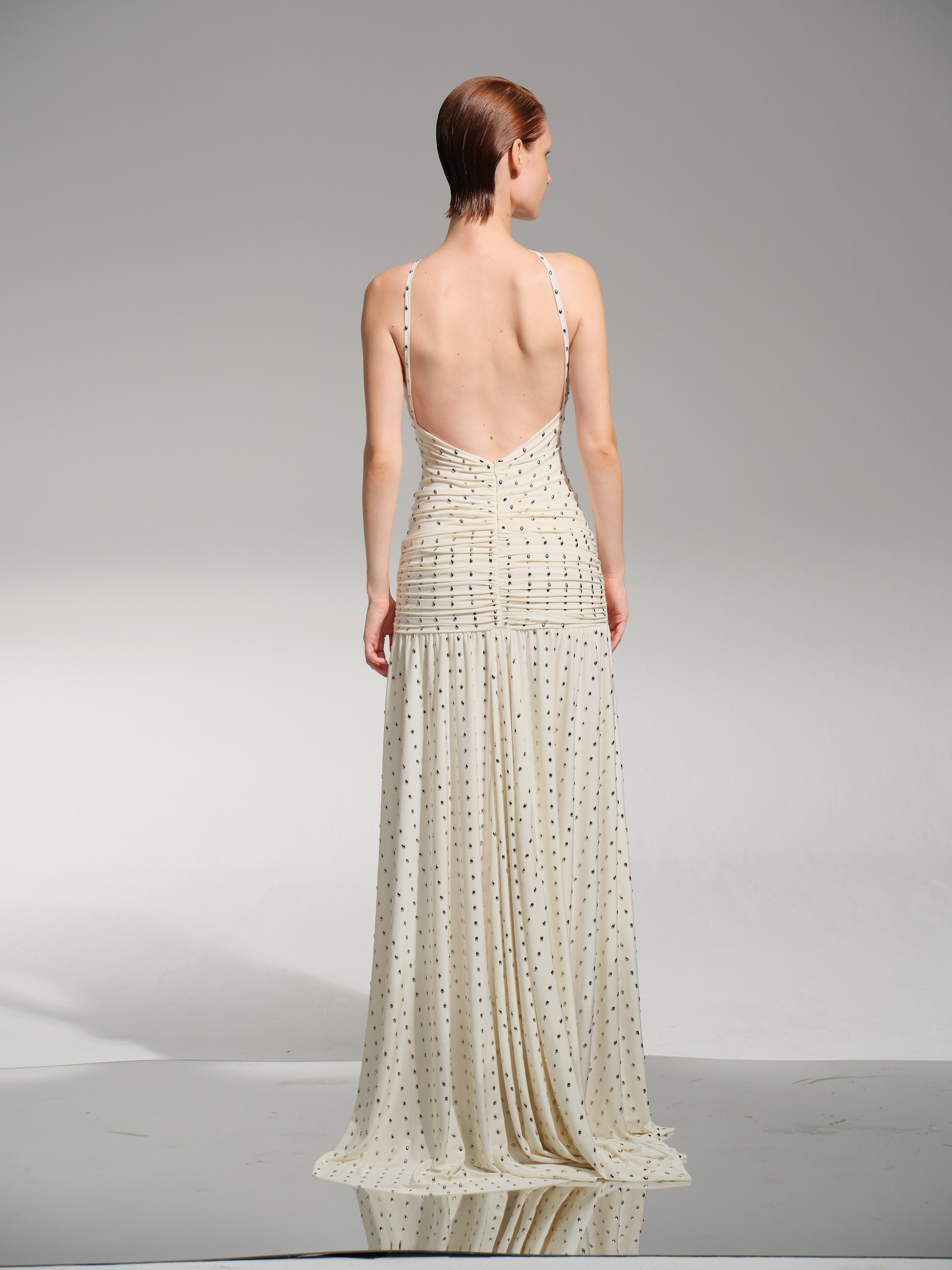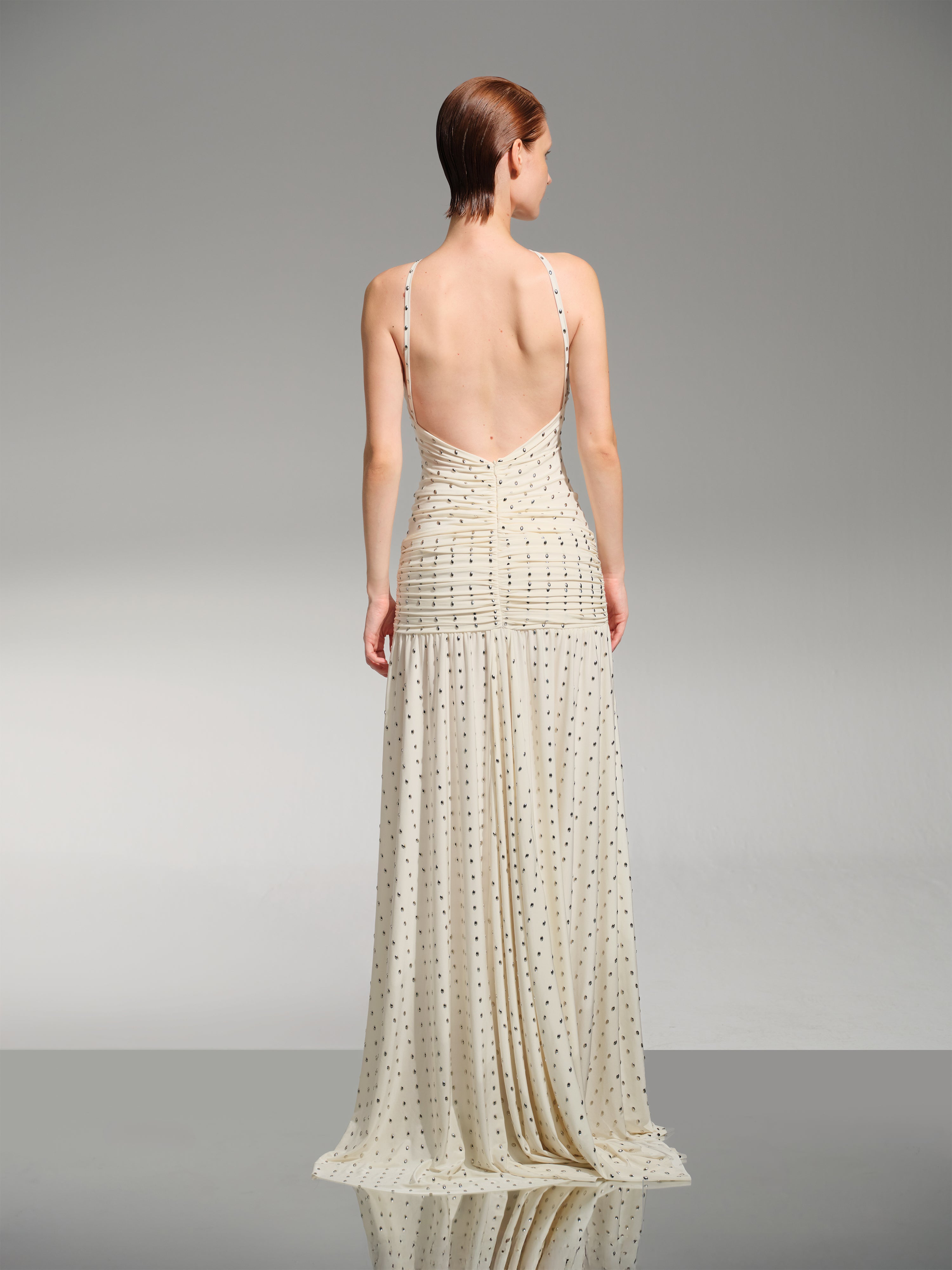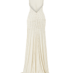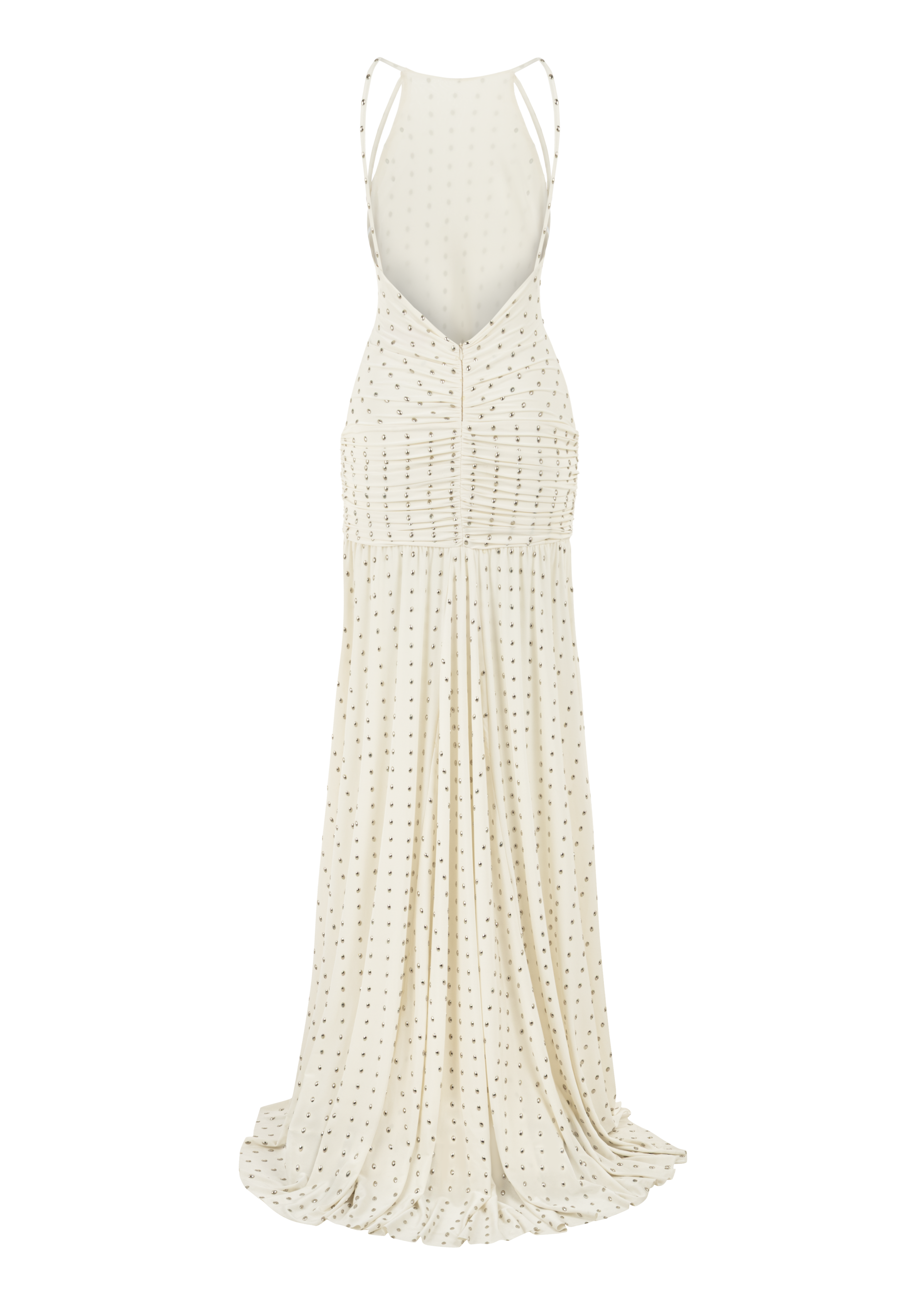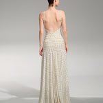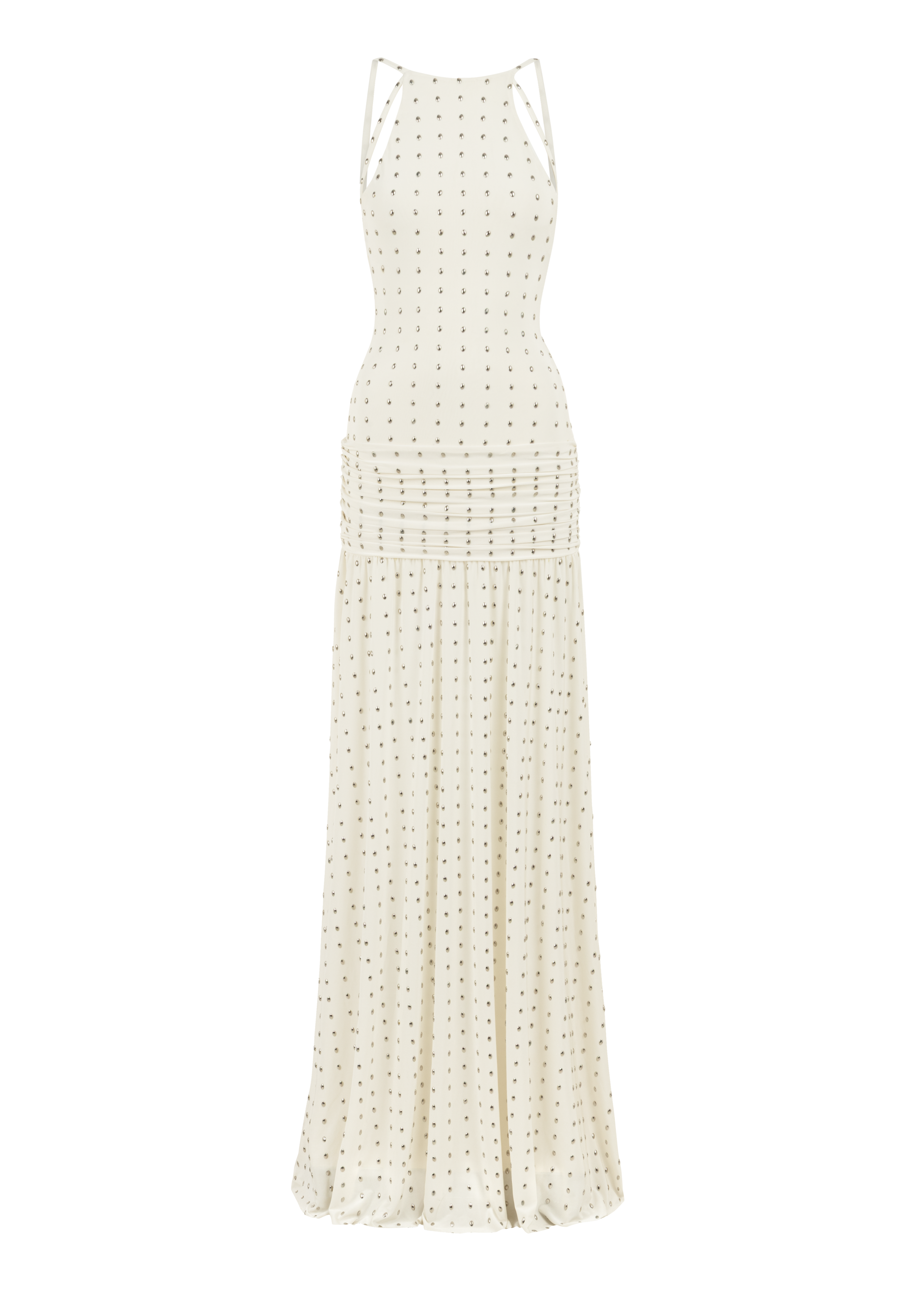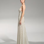 The Elsa dress captures quiet sophistication with its halter neckline and flowing length. Softly detailed fabric adds light texture, while the silhouette moves with grace. A timeless design made to bring understated elegance to evening occasions.