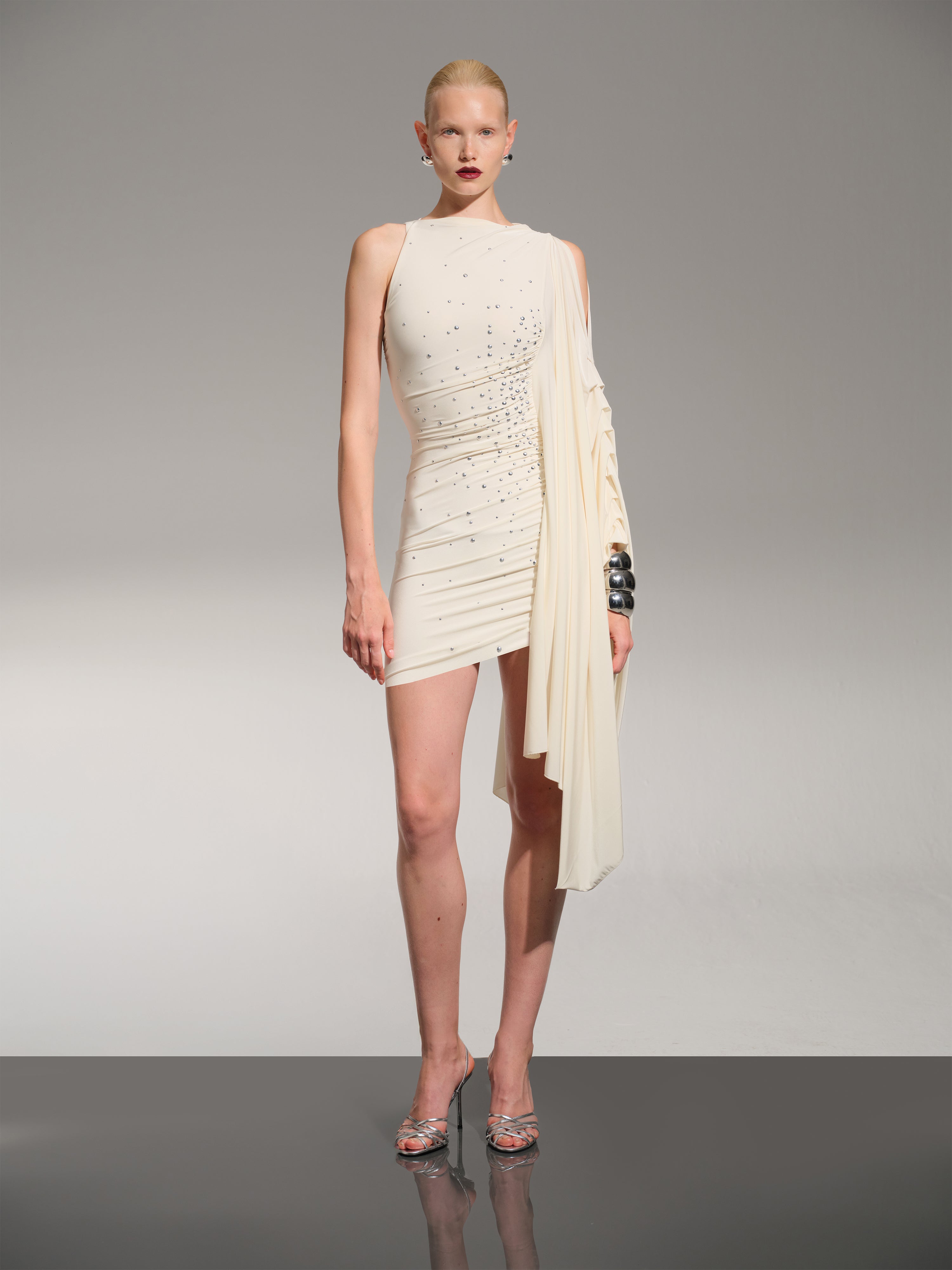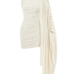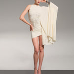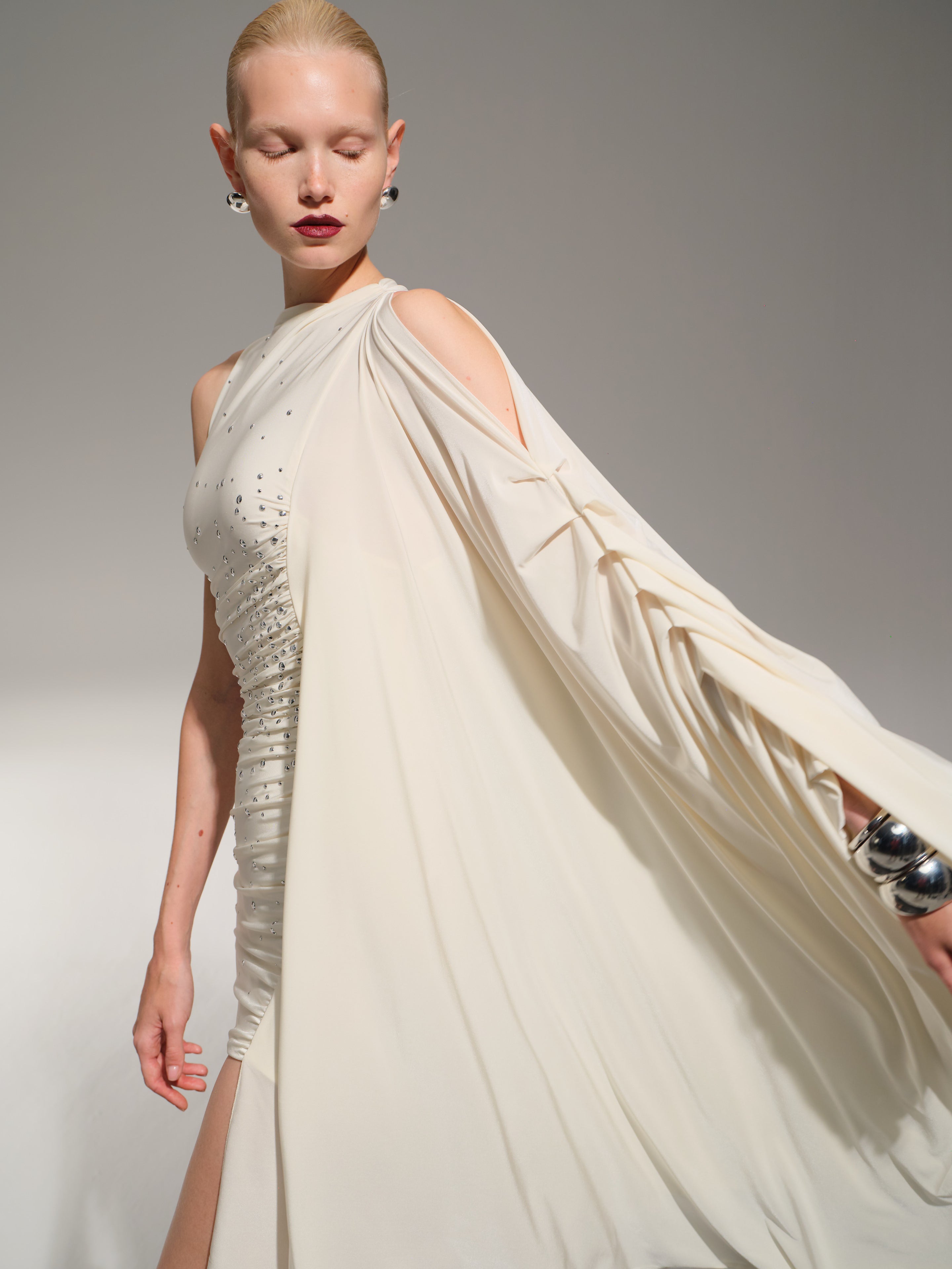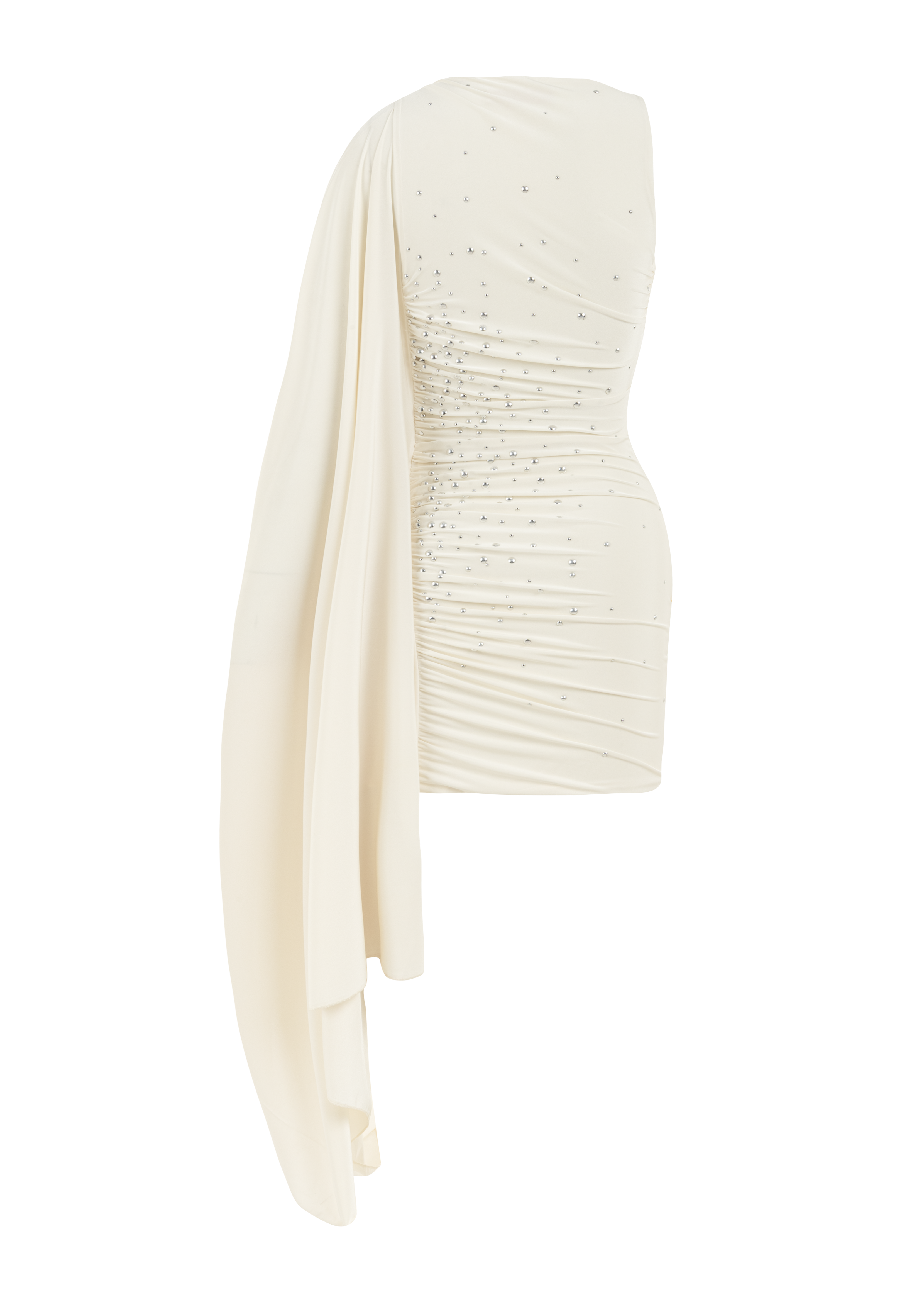 Sculpted in a modern one-shoulder shape, this style balances confidence with ease. Draped accents fall softly to the side, while the texture adds subtle shine. The Hélène dress is crafted for evenings that call for refined glamour.