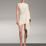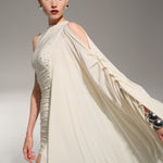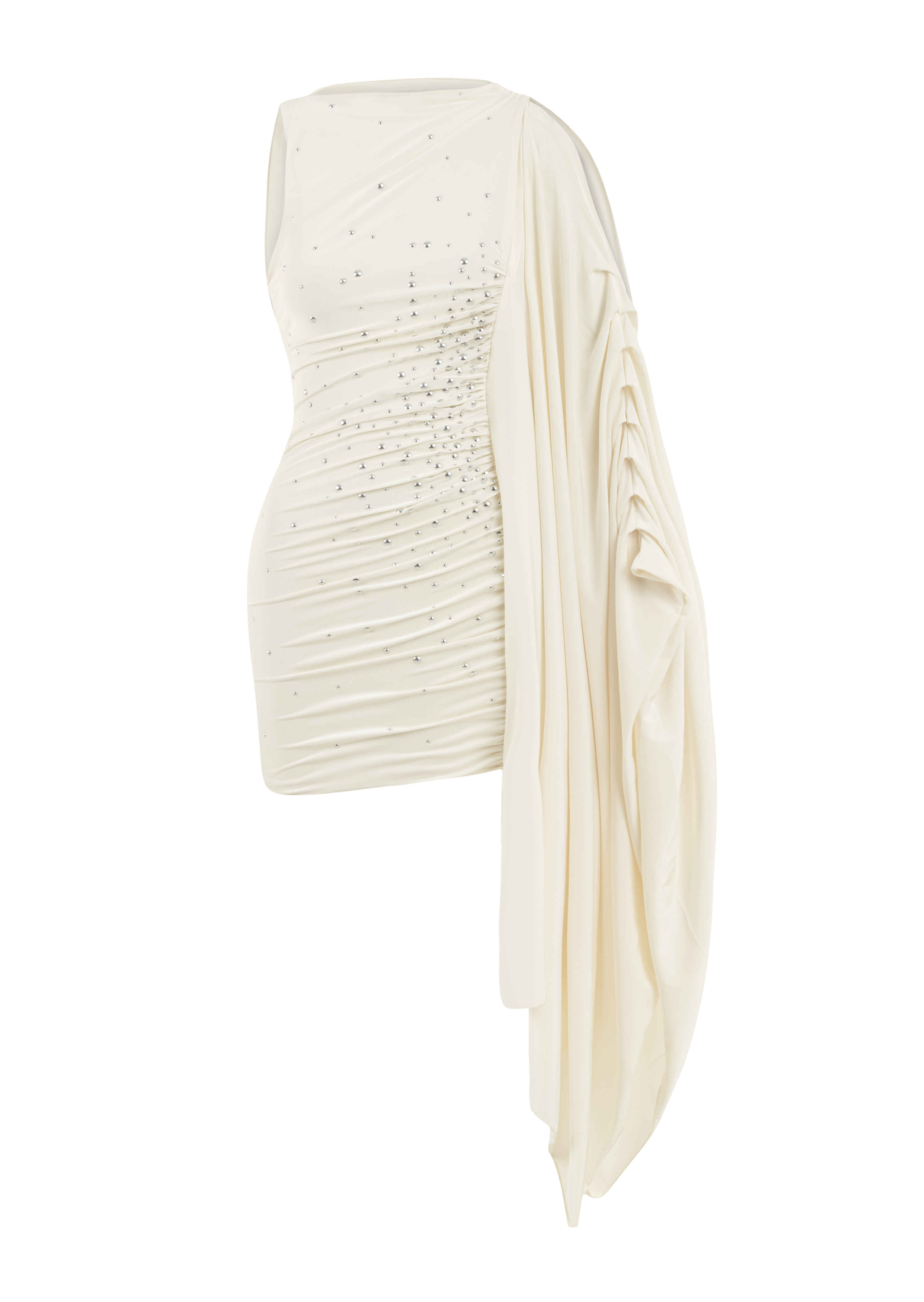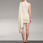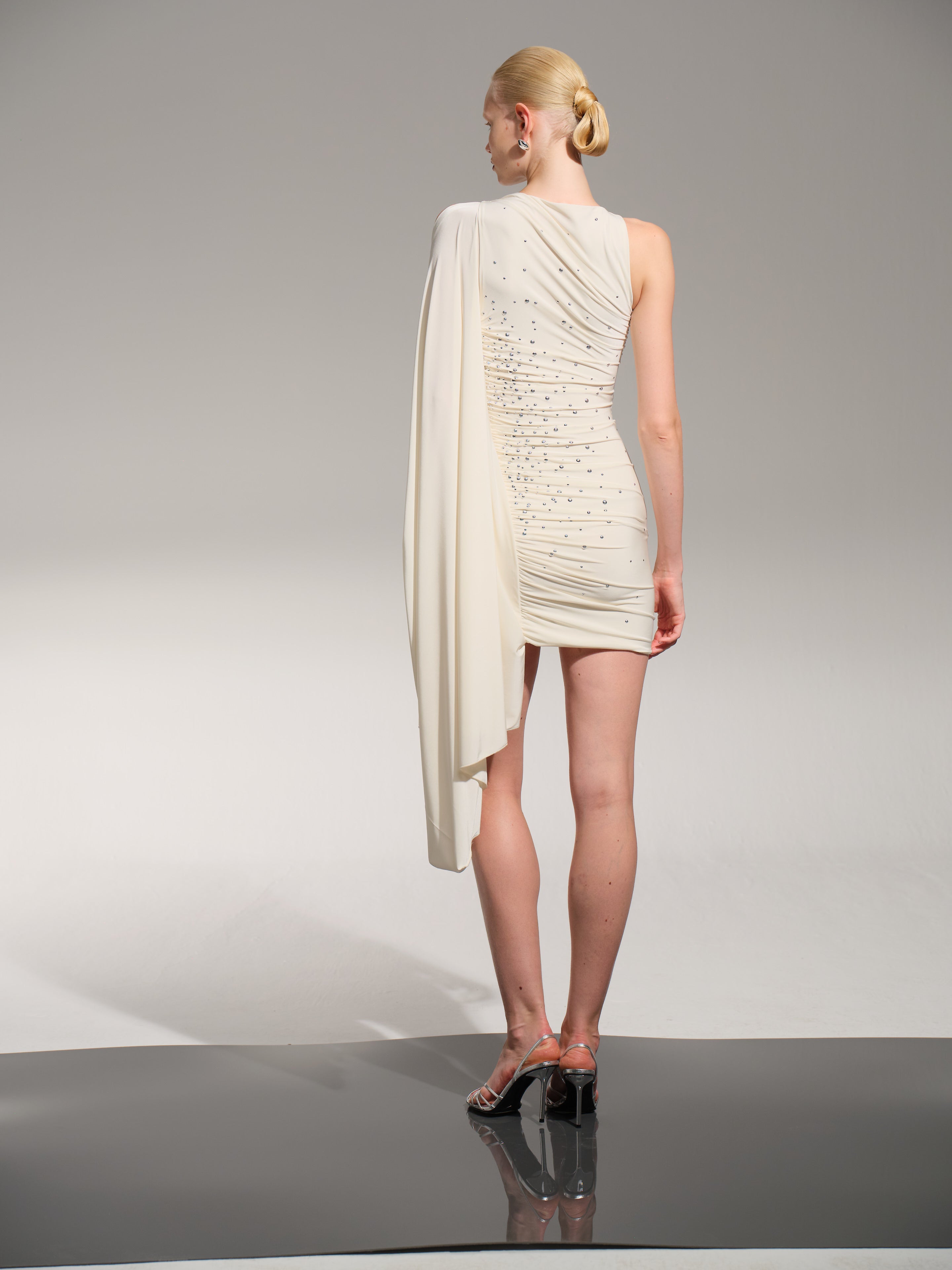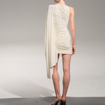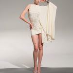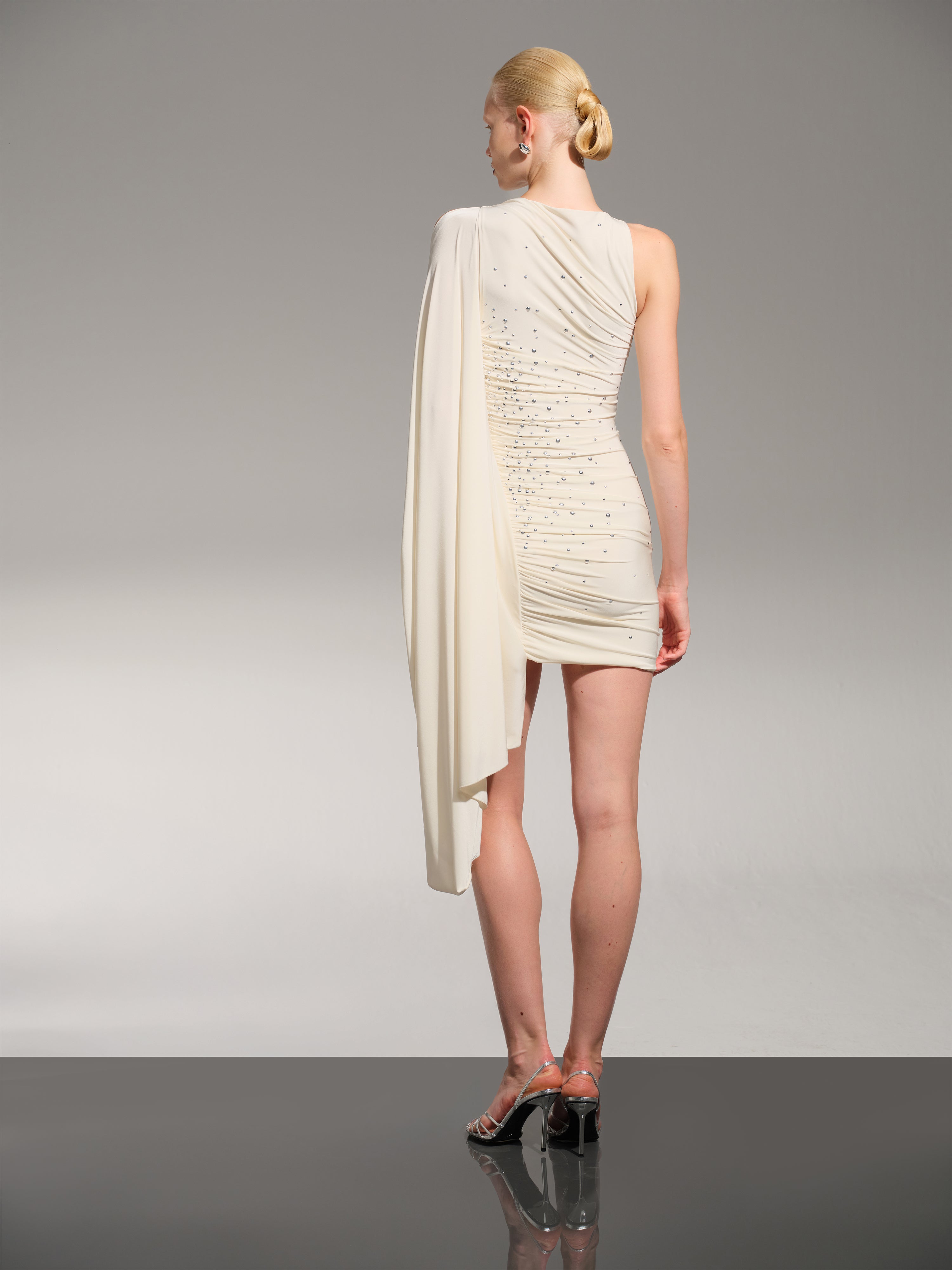 Sculpted in a modern one-shoulder shape, this style balances confidence with ease. Draped accents fall softly to the side, while the texture adds subtle shine. The Hélène dress is crafted for evenings that call for refined glamour.