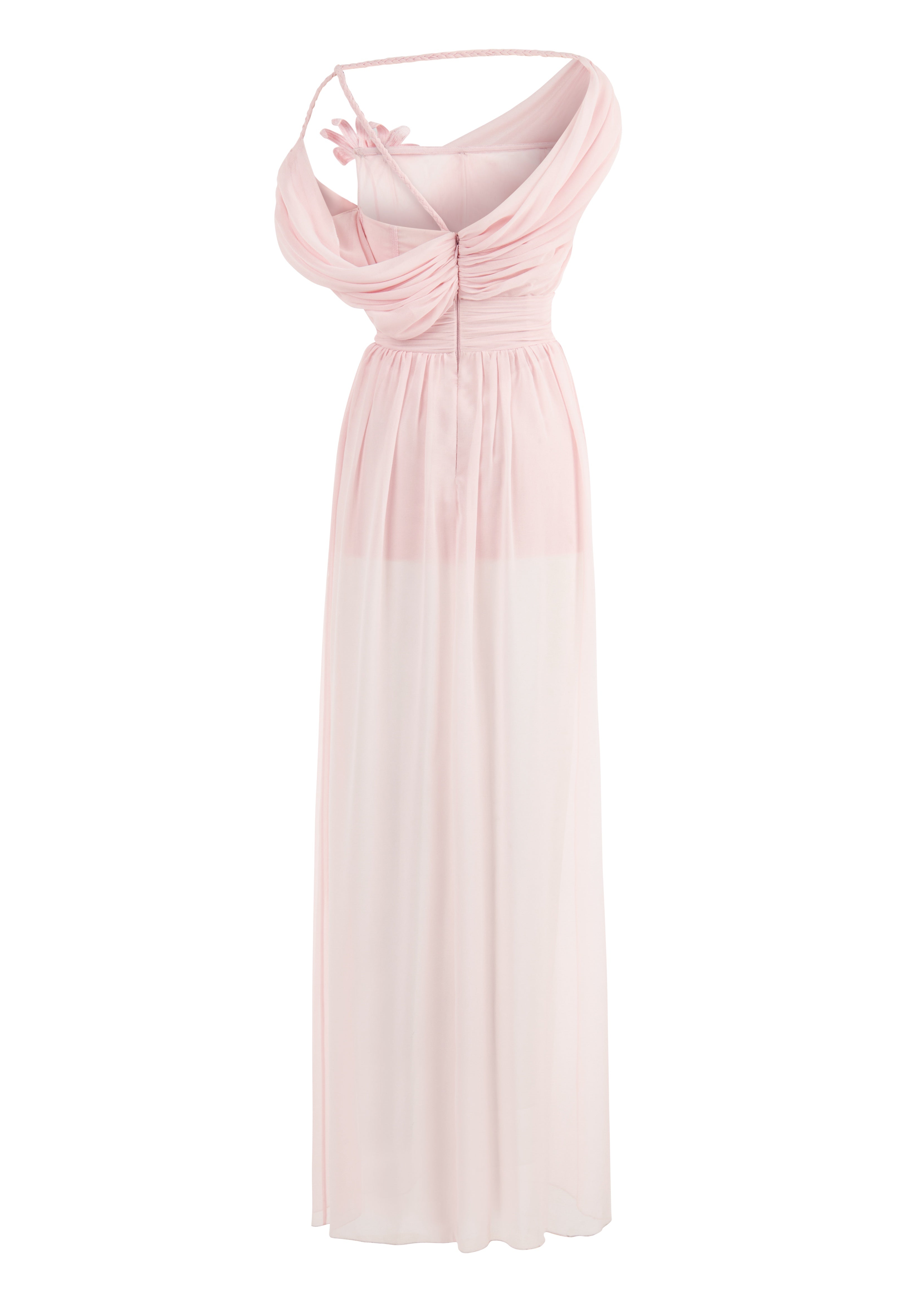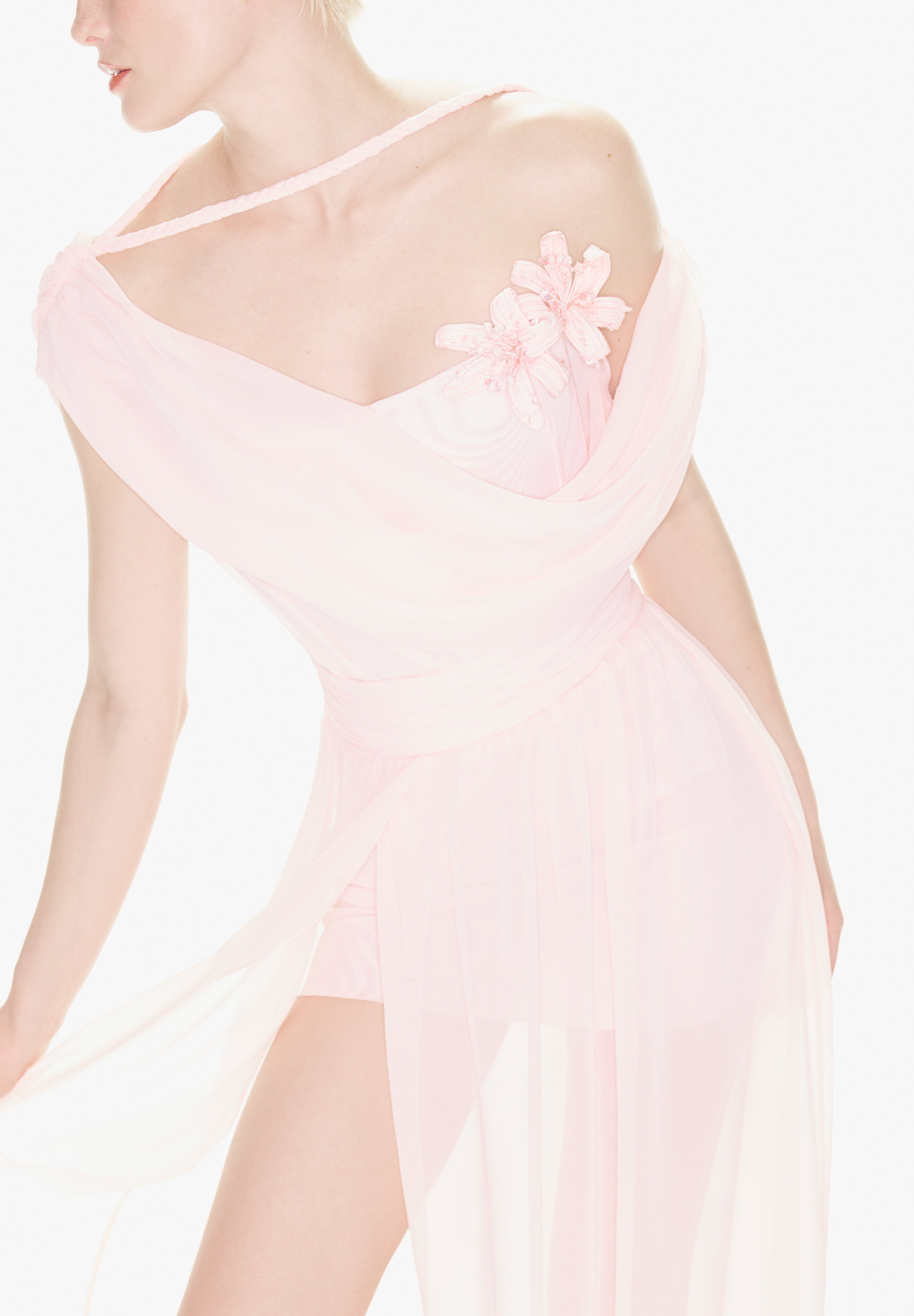 With its fairy-tale silhouette, powder pink colour and flower detail, the "Iris" dress increases the romance of summer invitations.