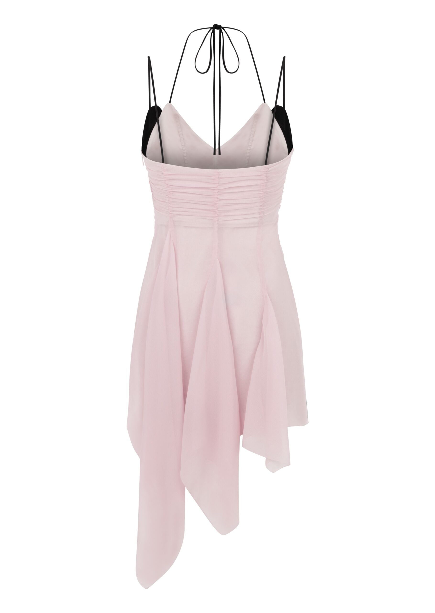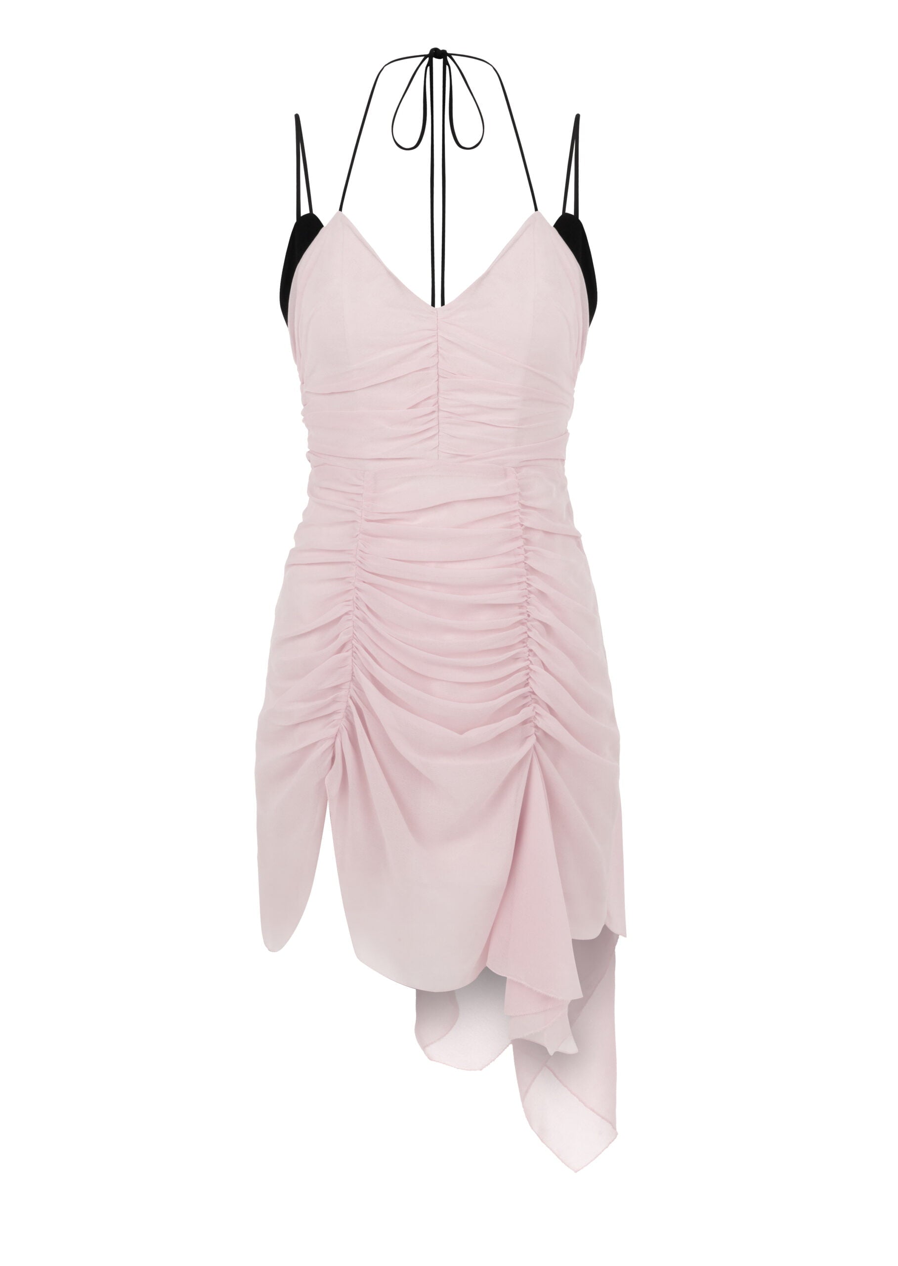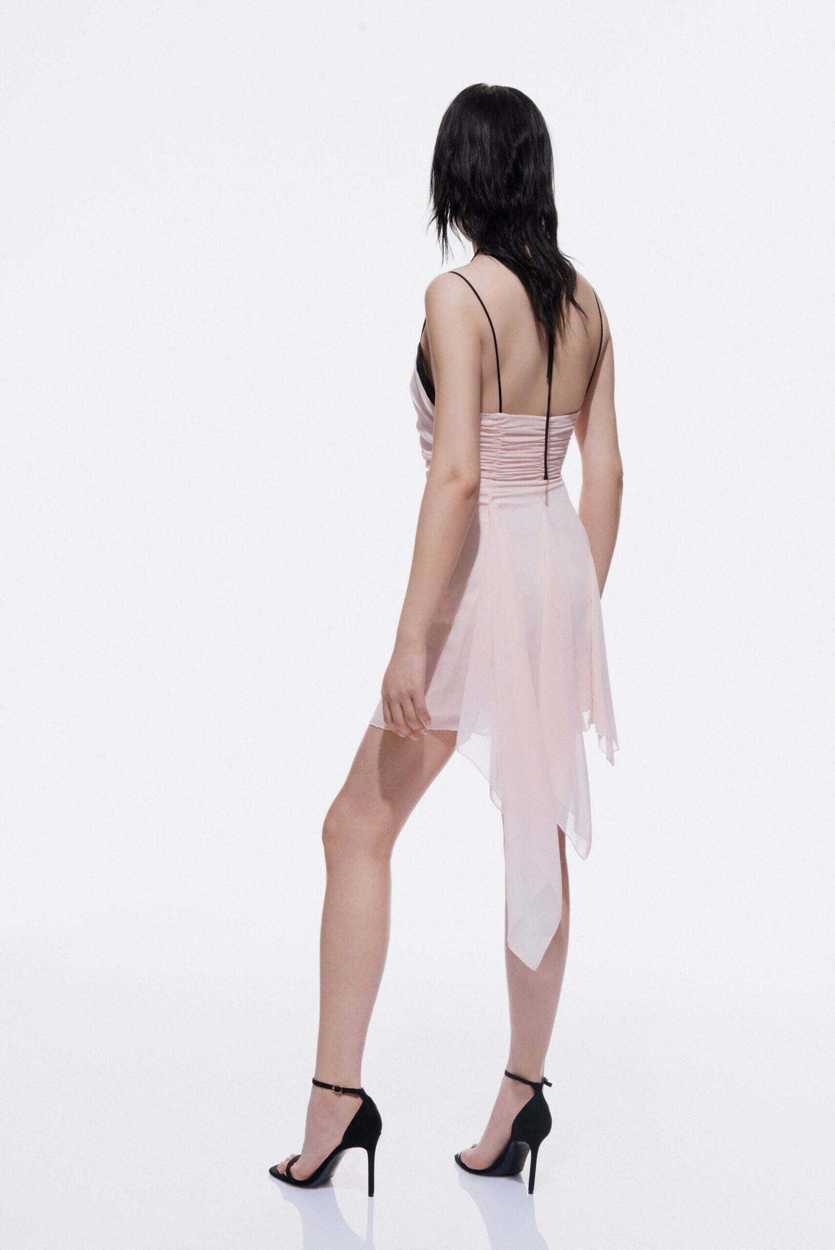 The design that enhances romance. The “Isla” mini dress in light pink is breathtaking with its draping and slits.