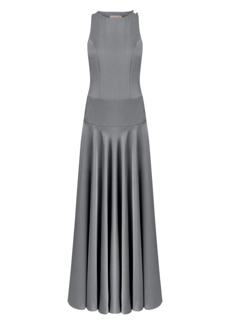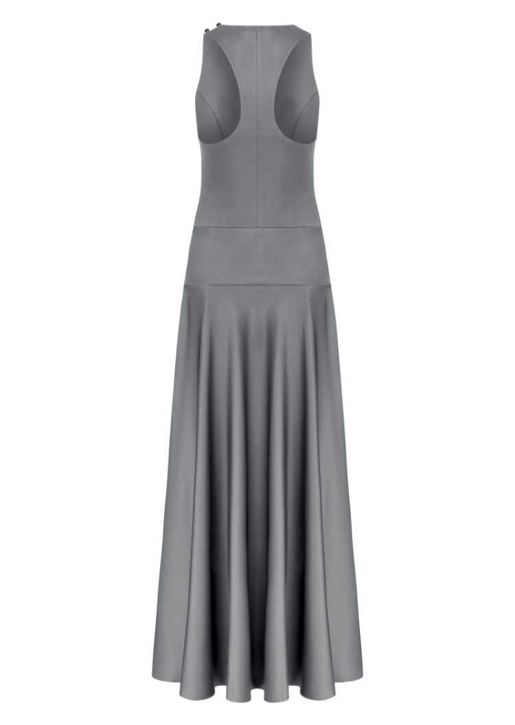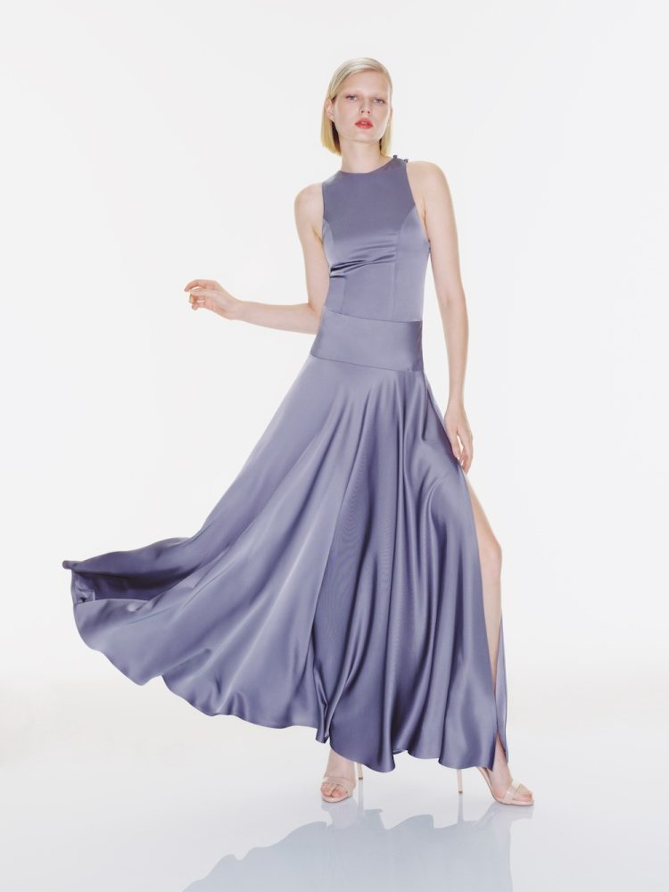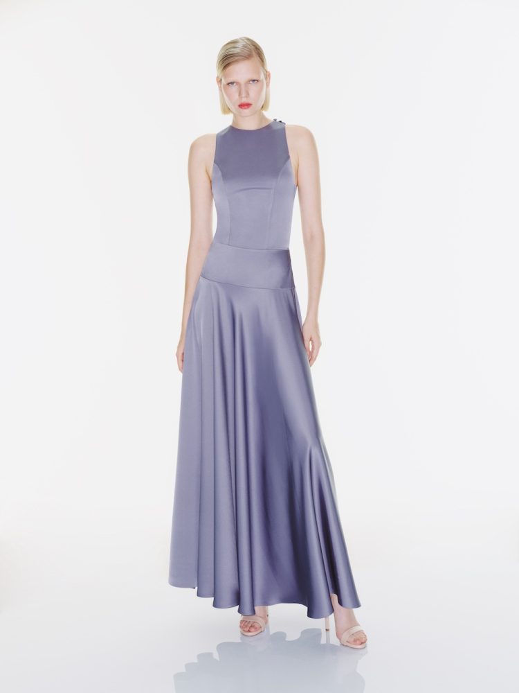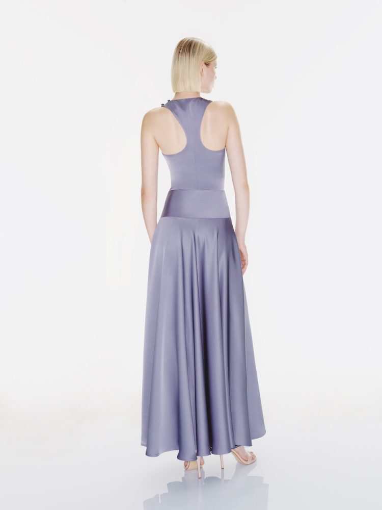 The “Jeanne” dress creates a sporty atmosphere with its neckline and back cut, while reflecting elegance with its flowing, flared skirt.