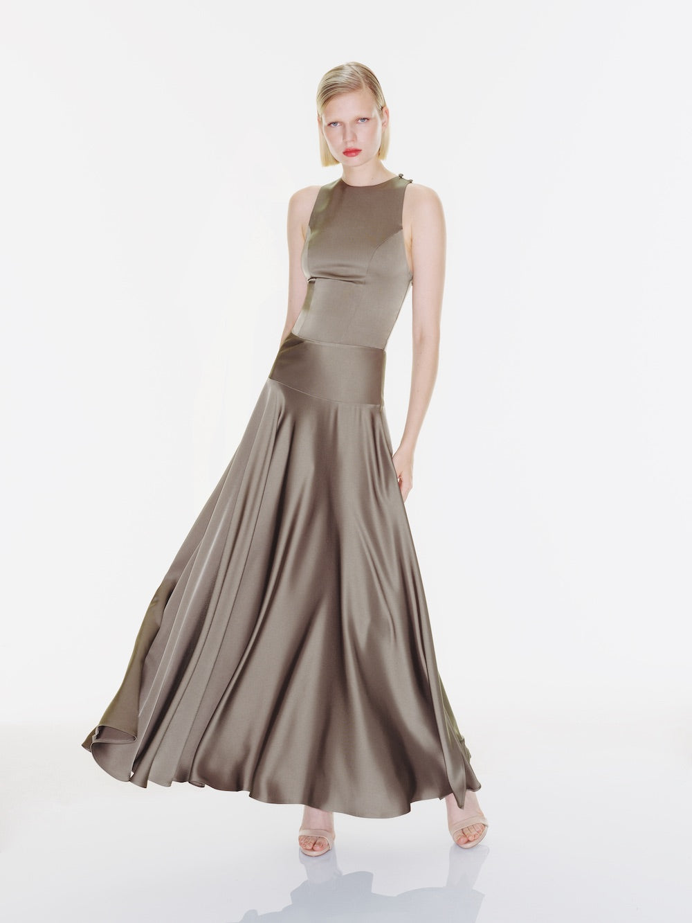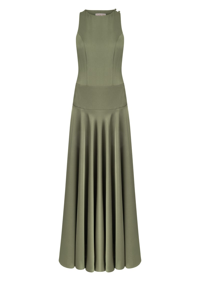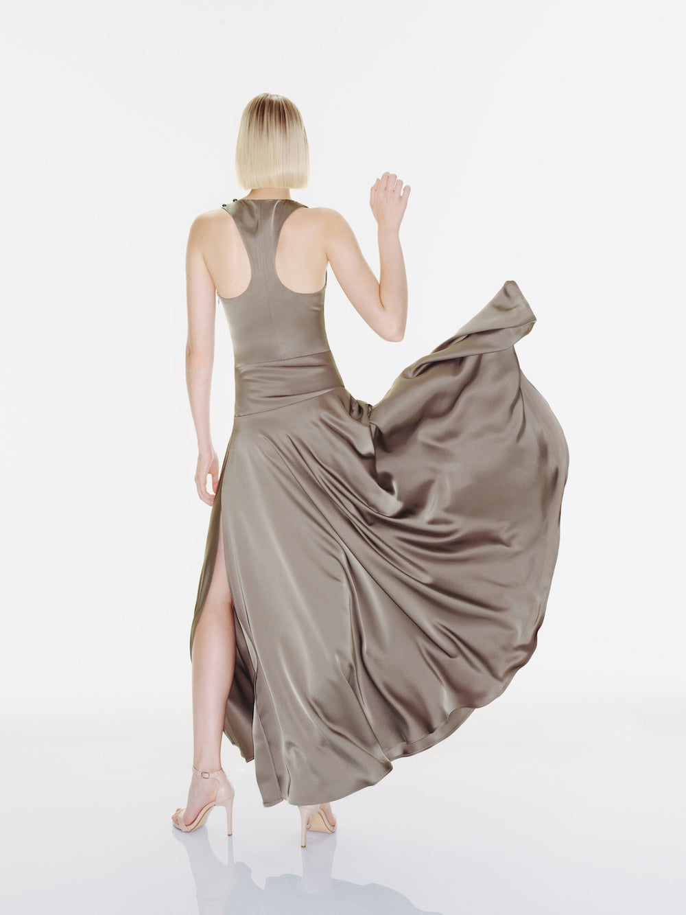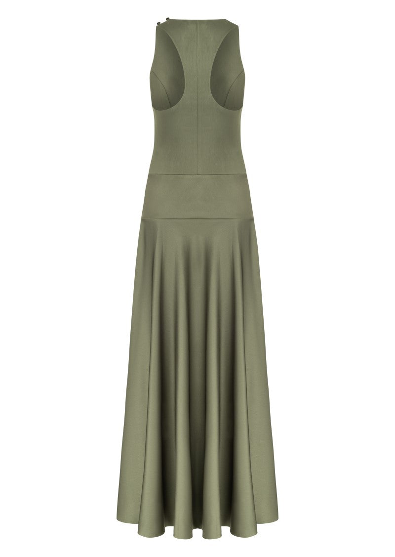 The “Jeanne” dress creates a sporty atmosphere with its neckline and back cut, while reflecting elegance with its flowing, flared skirt.