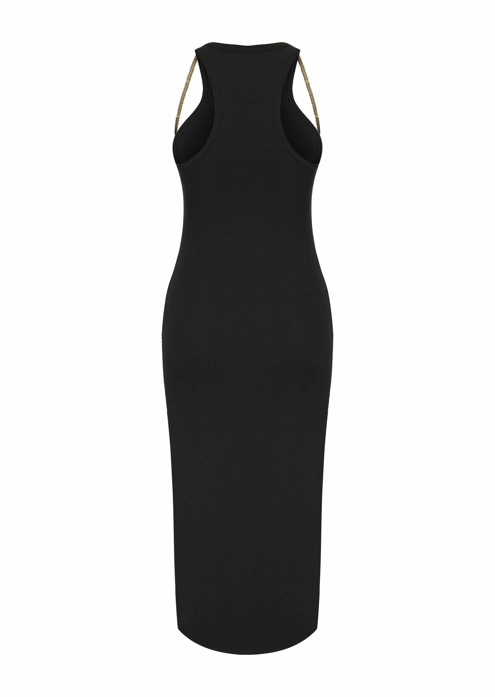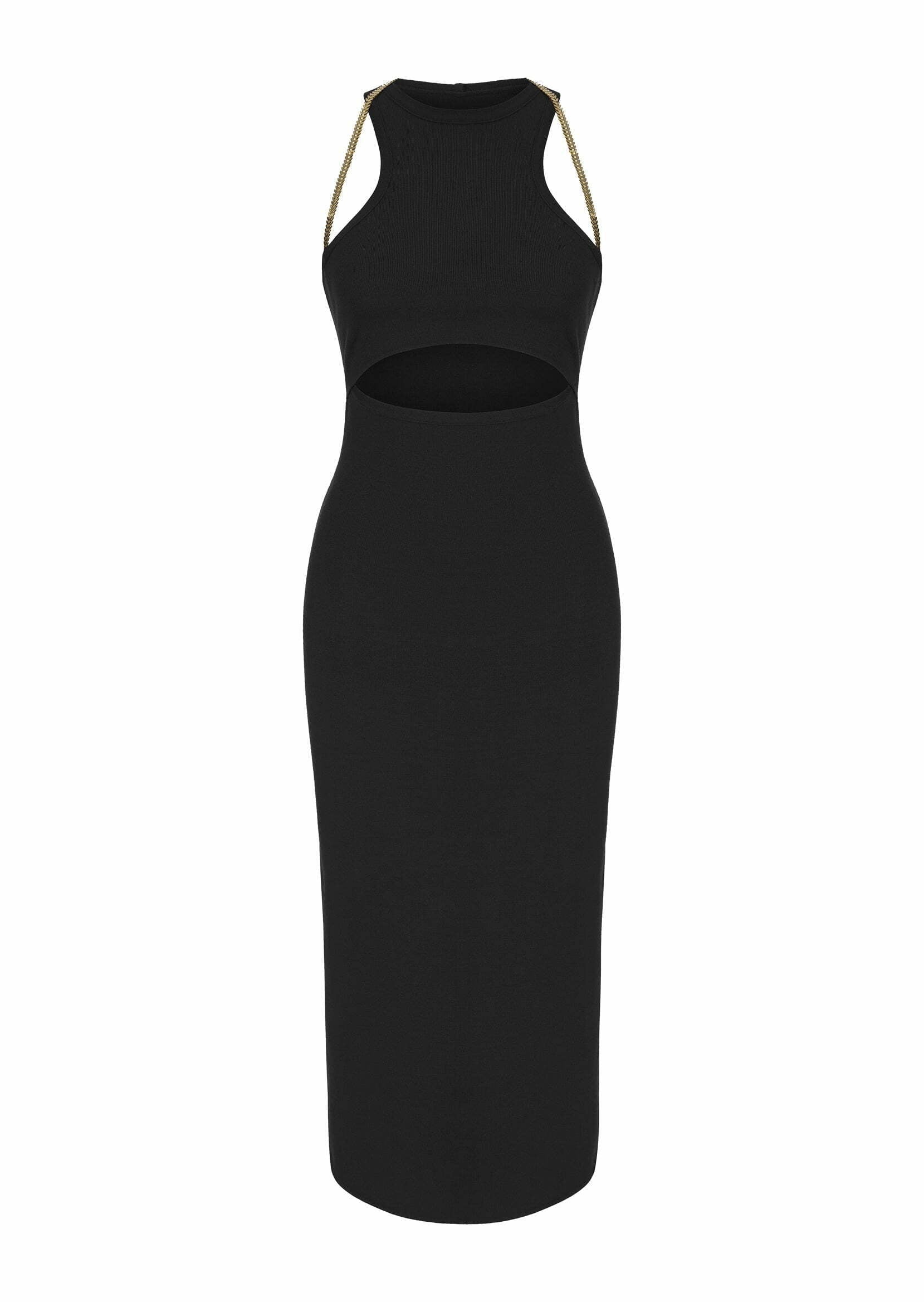 The “Maria” midi dress is made from soft, stretchy knit that fits snug to your body’s curves. The cut-out detail and the gold chain on the shoulders makes this the perfect day to night look.