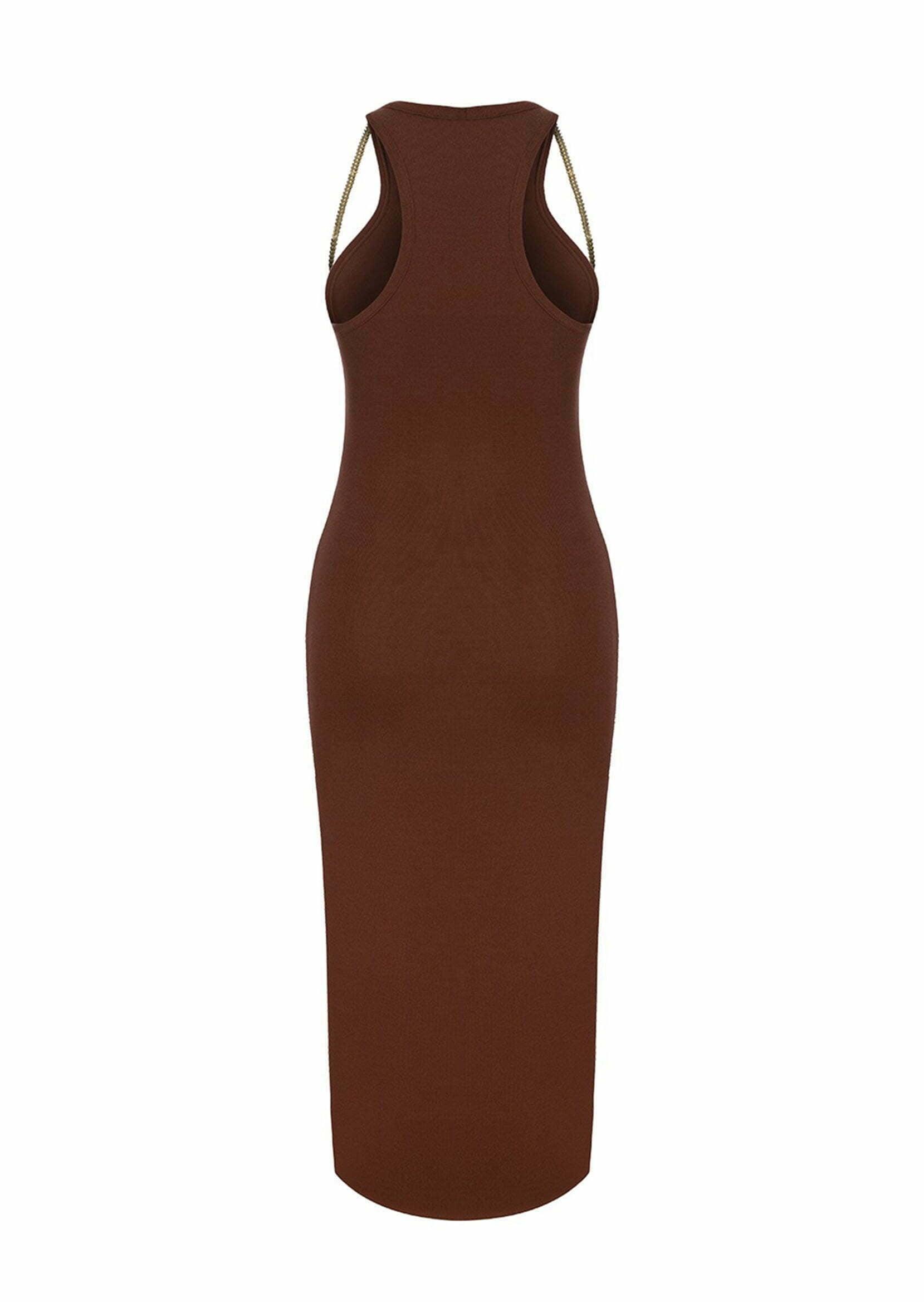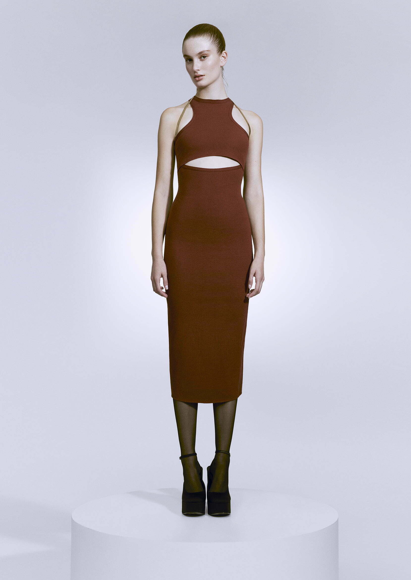 The “Maria” midi dress is made from soft, stretchy knit that fits snug to your body’s curves. The cut-out detail and the gold chain on the shoulders makes this the perfect day to night look.