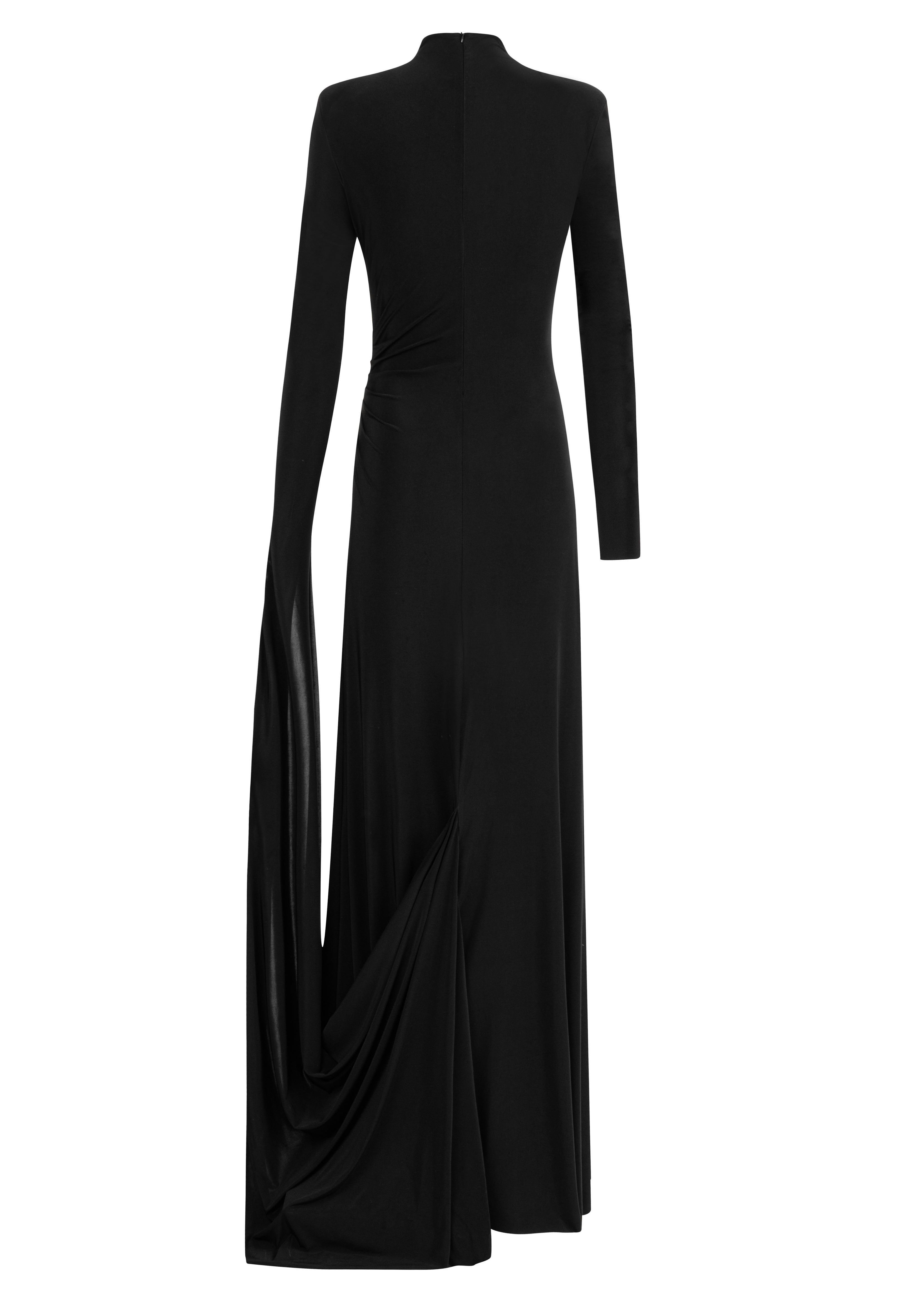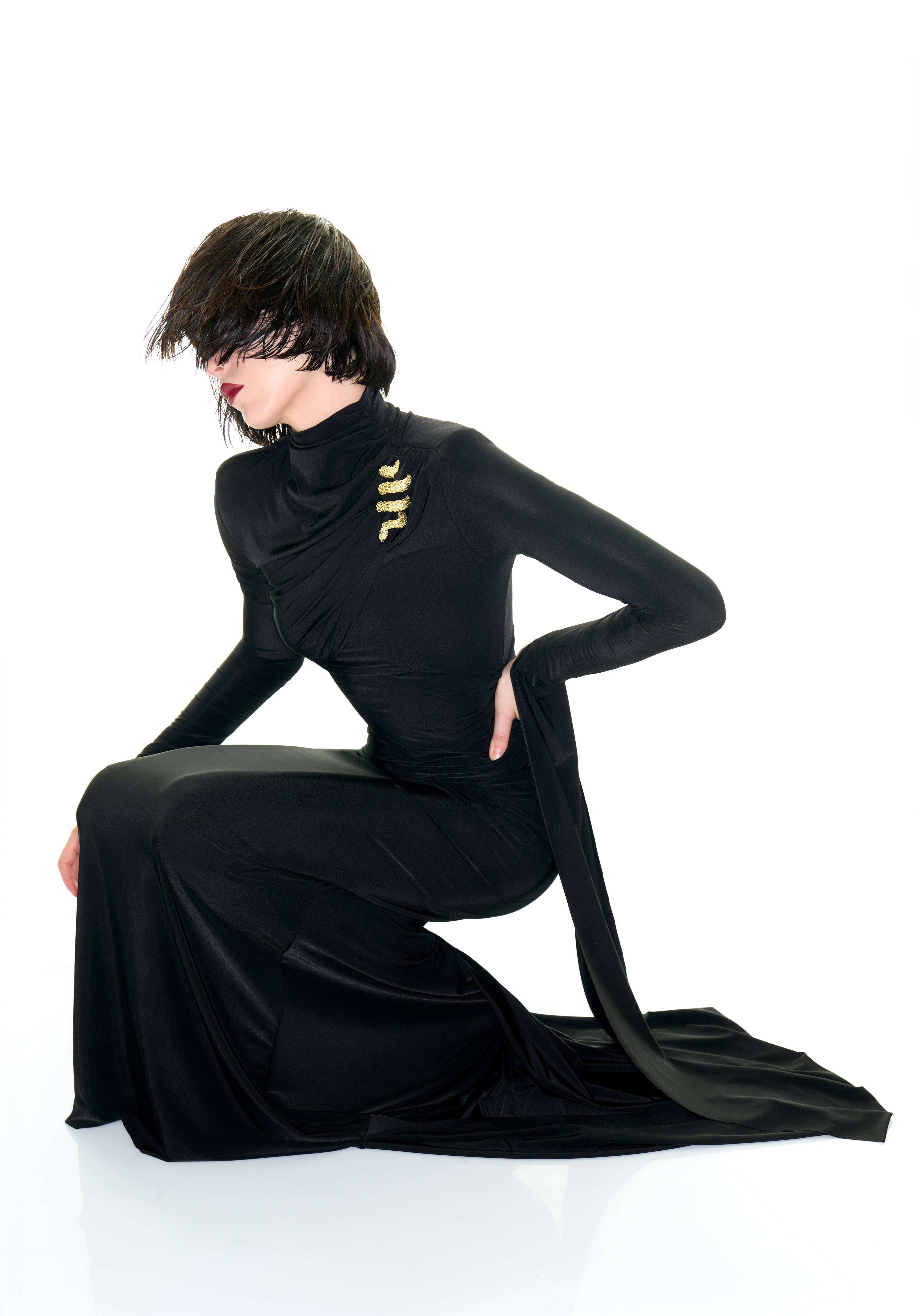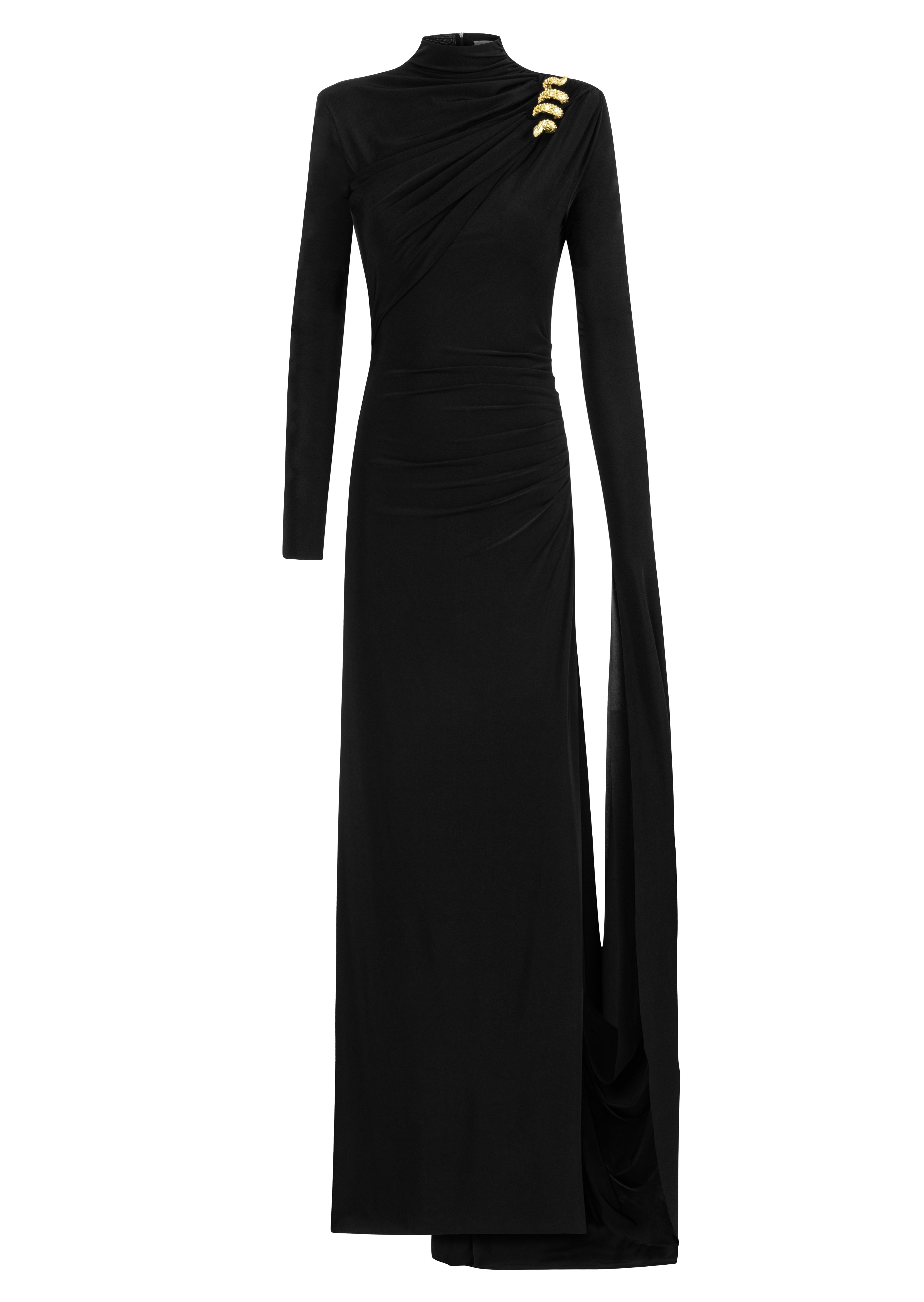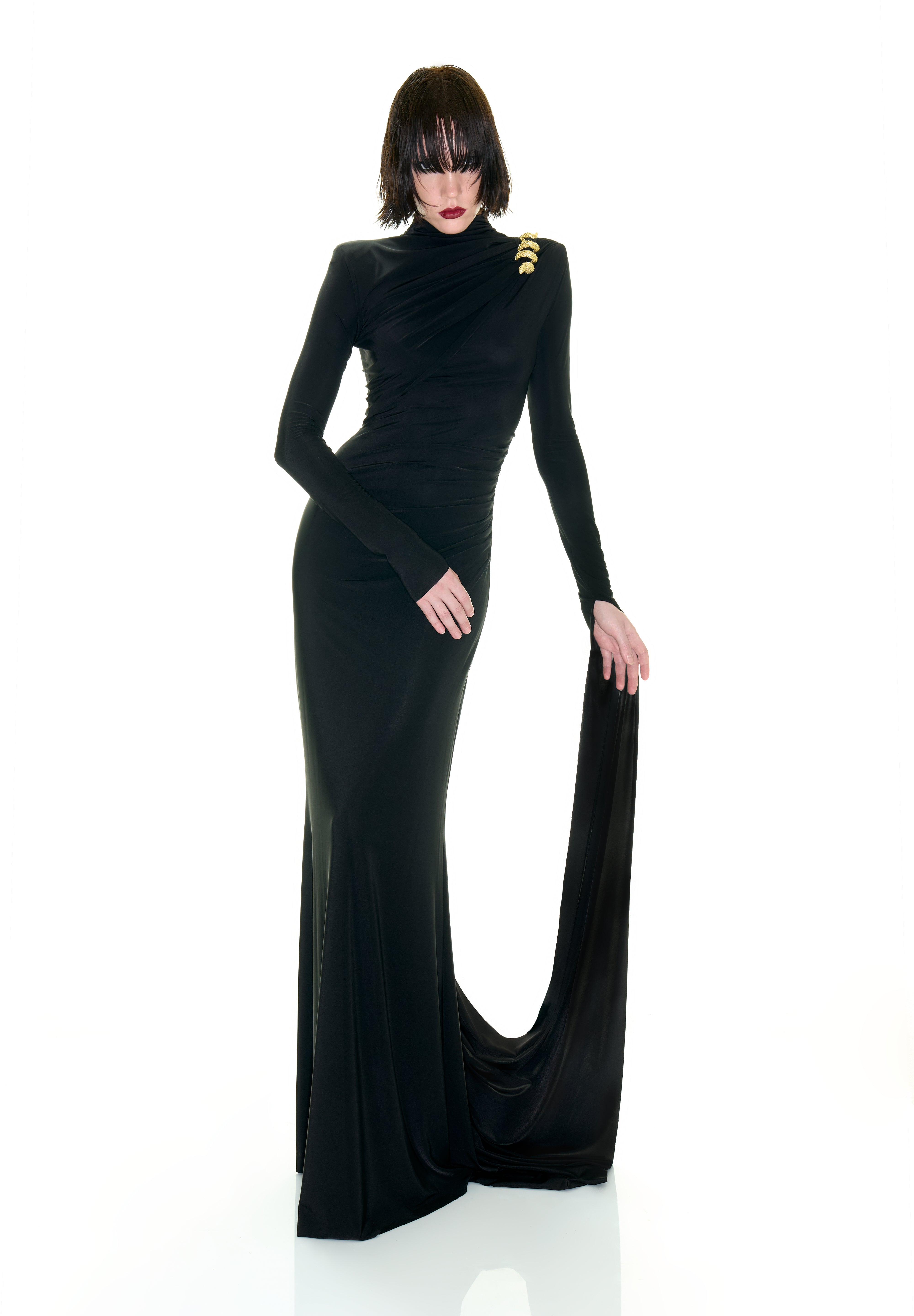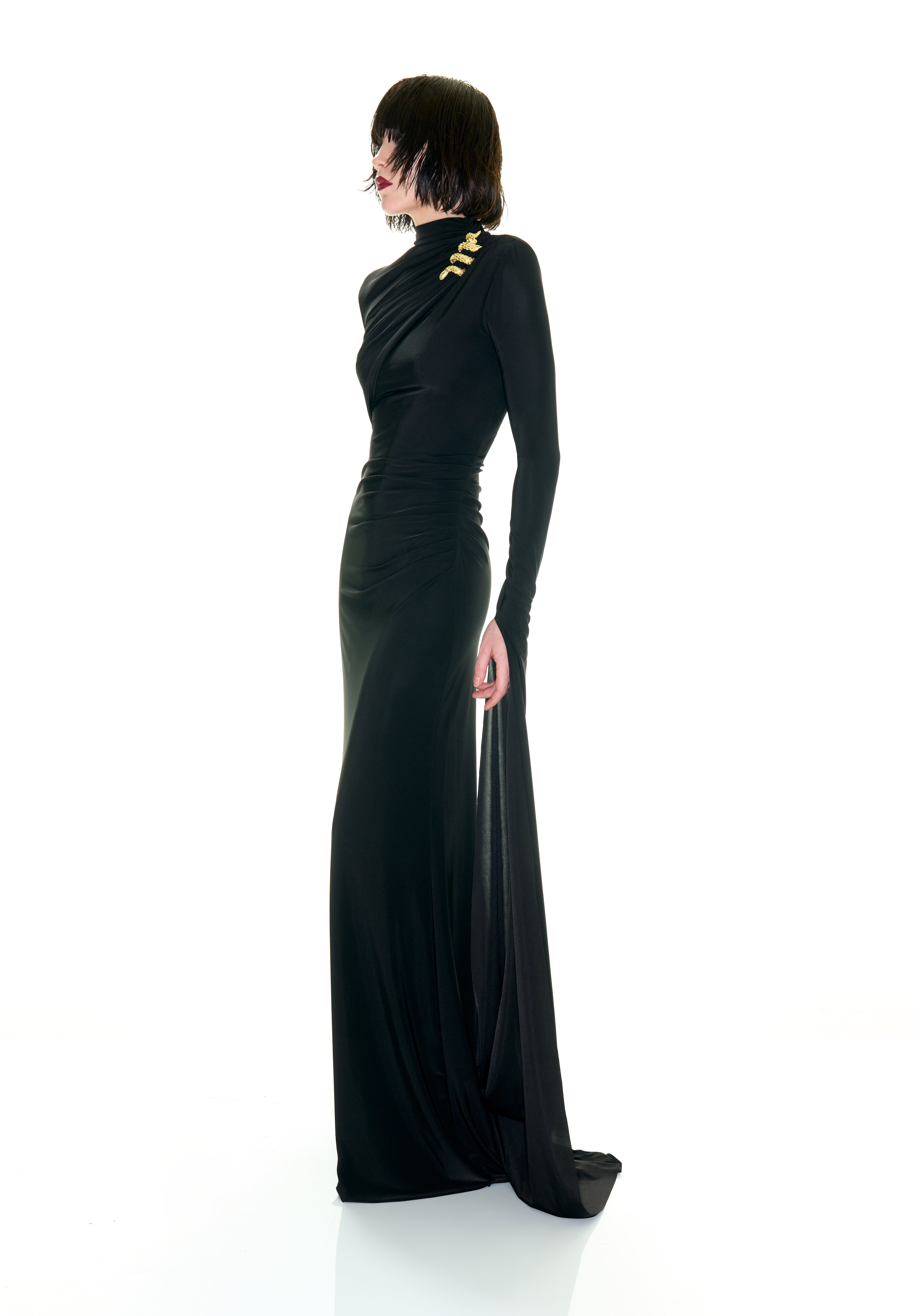 The “Medusa” dress is designed to capture attention with its bold and seductive design. Its form-fitting, elegant silhouette, long sleeves, and gold detail on the shoulder add power and mystery to the dress. An essential piece for those who want to be the most striking woman of the night.