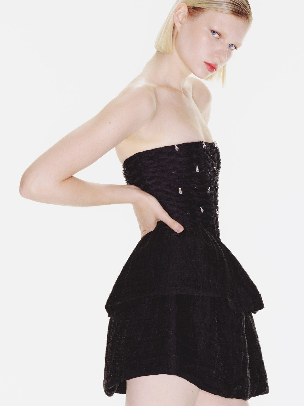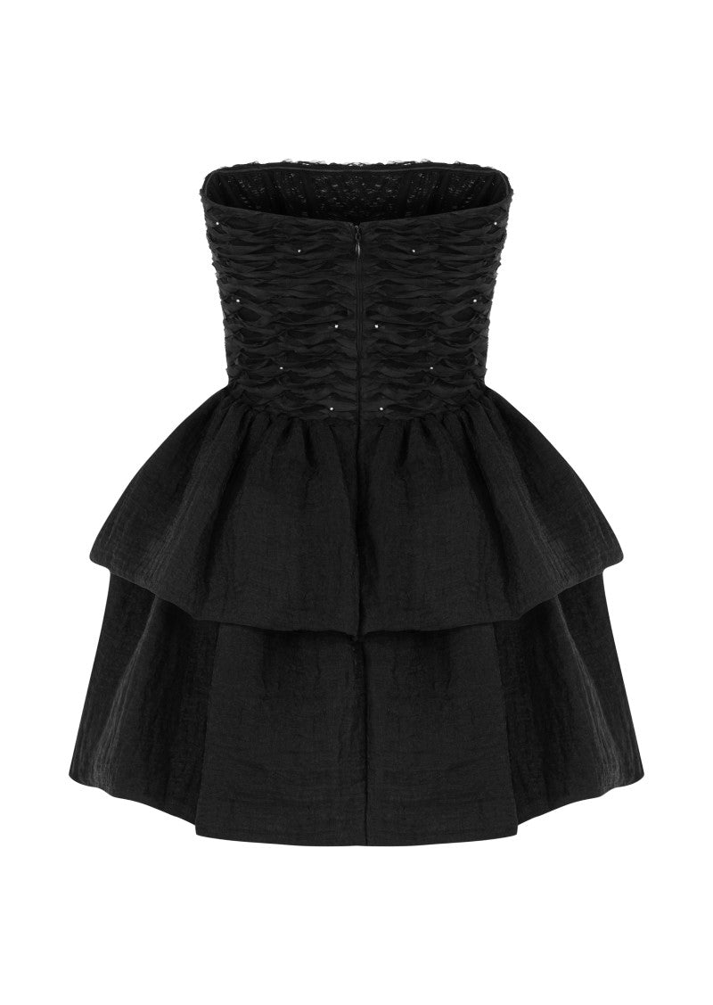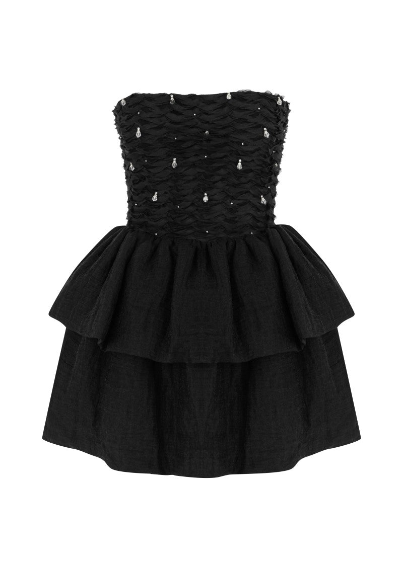 Meet the most sophisticated version of the “little black dress” with stones embellished corset that emphasizes the waist.